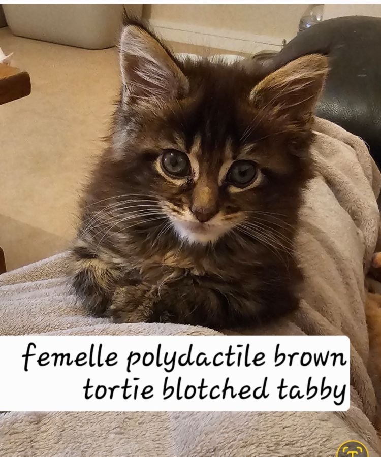 Petite chatterie familiale propose a l'adoption une chatonne maine coon loof polydactile, de couleur Brown tortie blotched tabby ; nés le 21 novembre 2025 .