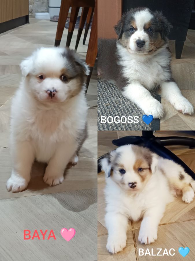 3 chiots de 8 semaines/ département 17 cherchent une famille pour la vie 12/15 ans...1 mâle tricolore surnommé BOGOSS, 1 femelle bleu merle/ grise prénommée BAYA et 1 mâle bleu merle comme Maman prénommé BALZAC... Déjà sevrés, Nous serons vaccinés, vermifugés, pucés avec certificat de bonne santé dès mardi 10/03... Élevés en famille, câlins assurés.... Numéro de portée 2025041346-2026-1