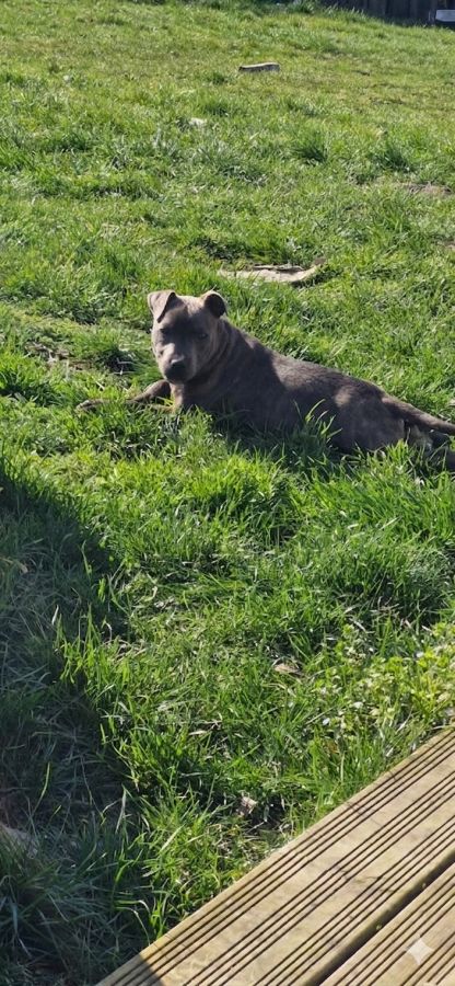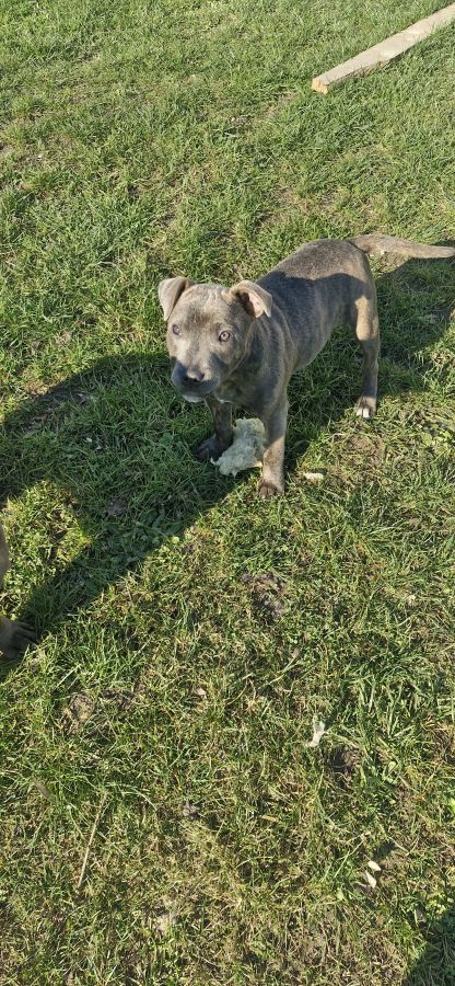 Suite à un retour en élevage, il reste un chiot mâle à la robe bleu/bringé. Il extrêmement attachant, joueur et déjà bien éveillé. Il est élevé dans un cadre familial, ce qui en fait un chien sociable et curieux de son environnement.