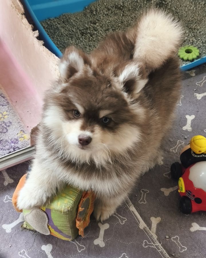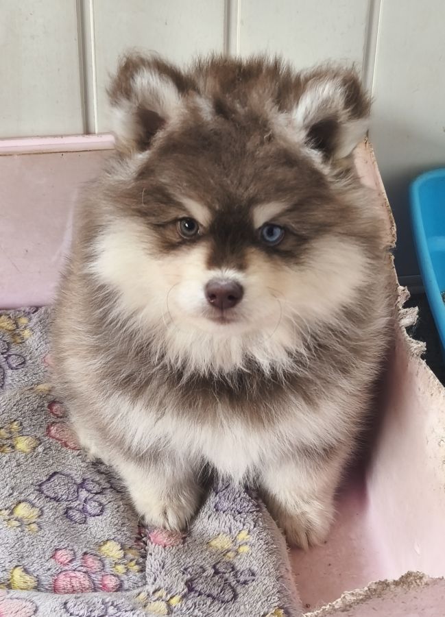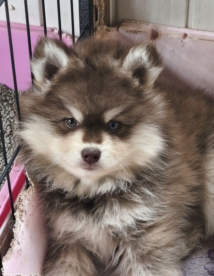 Disponible de suite magnifique petit mâle pomsky F4 de couleur chocolat.