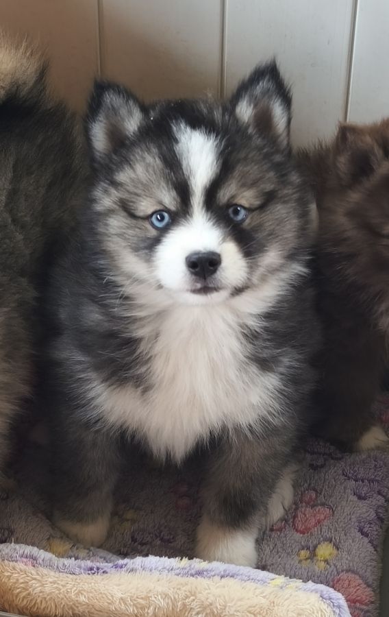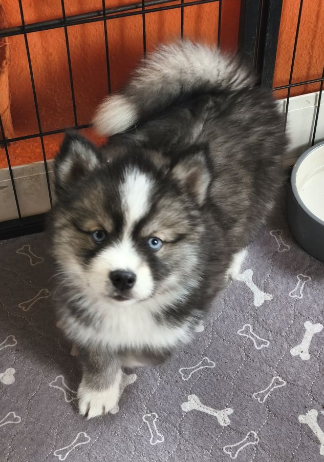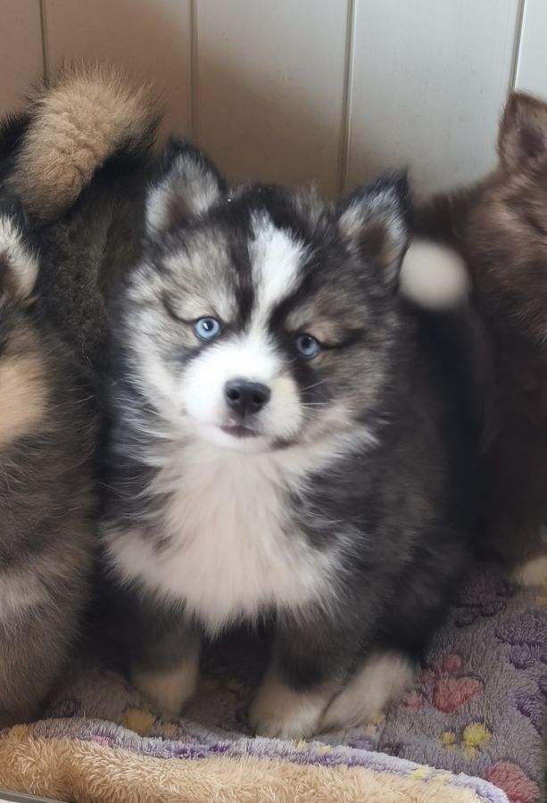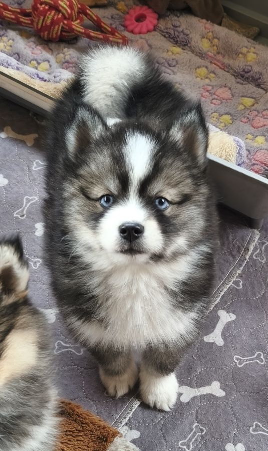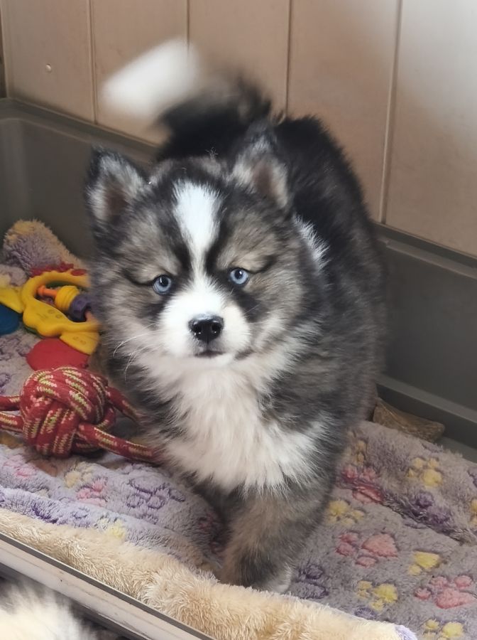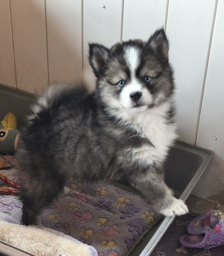 Disponible de suite magnifique petit mâle pomsky F4 de taille mini aux yeux bleus.