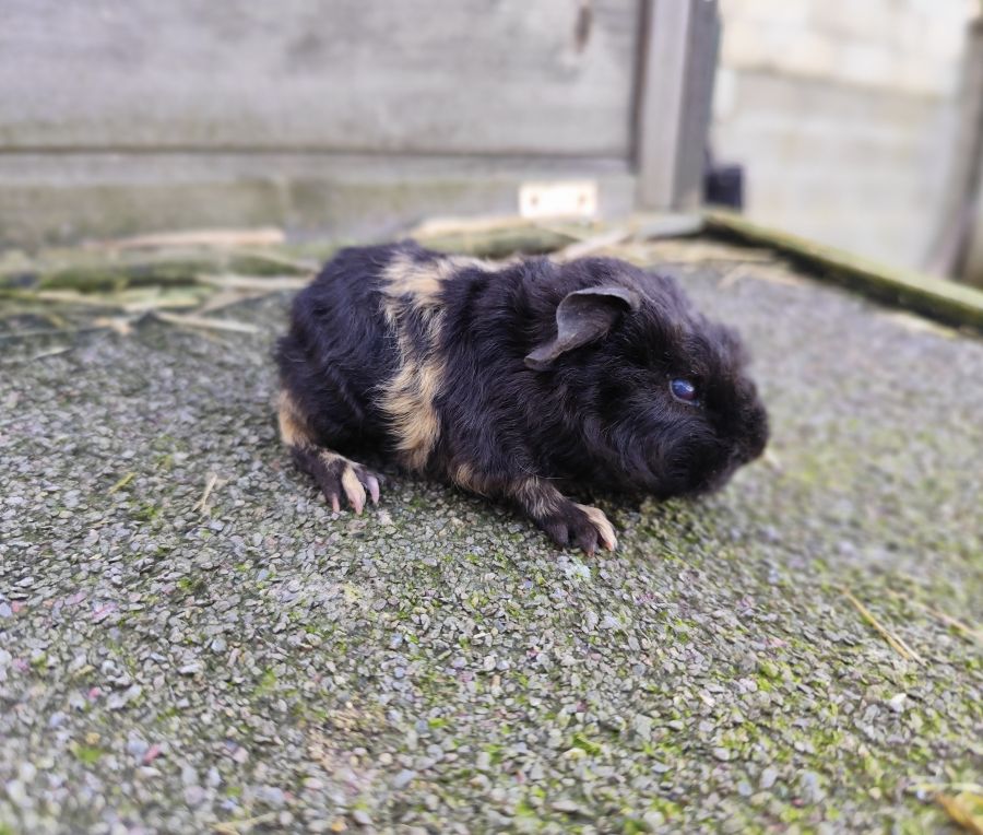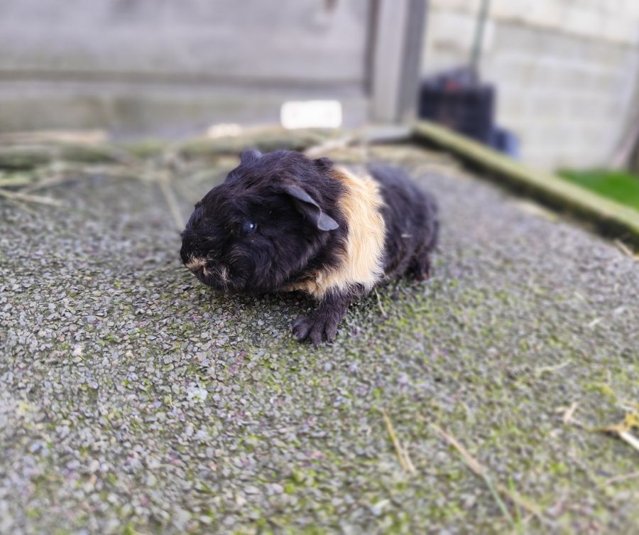 Bébé cochon d'Inde mâle bicolore, poils frisés, noir et crème. Il est né le 4 février 2026, il sera donc disponible à l'adoption à partir du 10 mars.