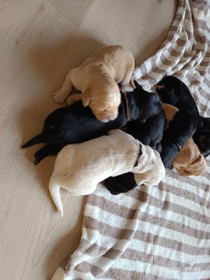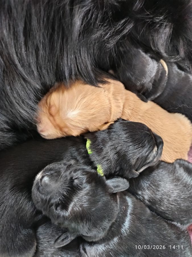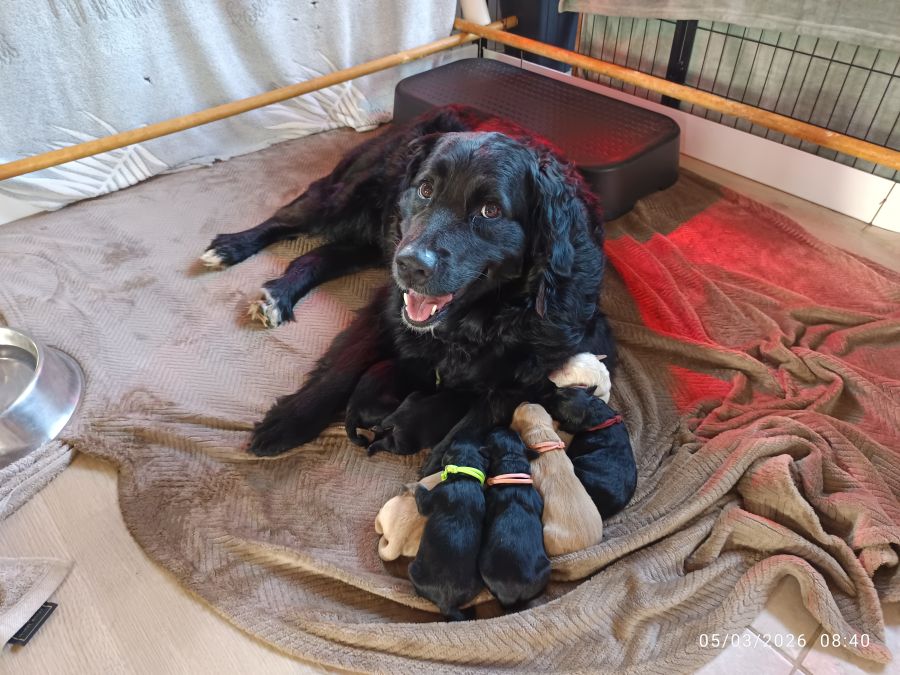 Adorables chiots type golden retriever (père golden pure race et mère golden retriever croisée bouvier bernois), nés le 4 mars 2026. Disponible à partir de début mai. 1mâle blanc, 1male noir et 1 mâle légèrement noir et feu (héritage Bouvier). Deux femelles noires, une sable et une noire et feu.