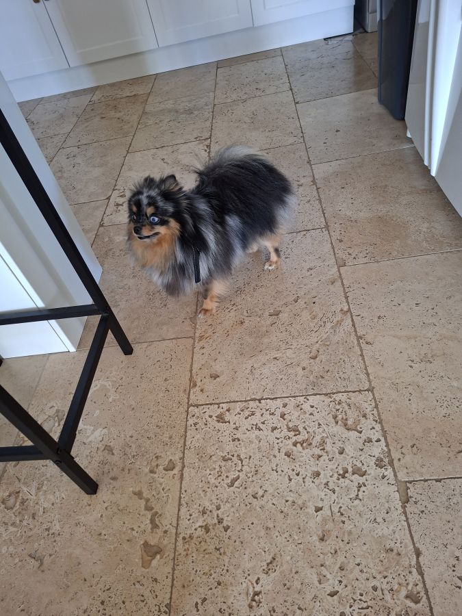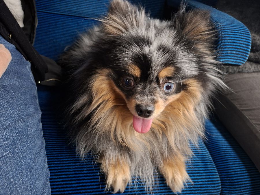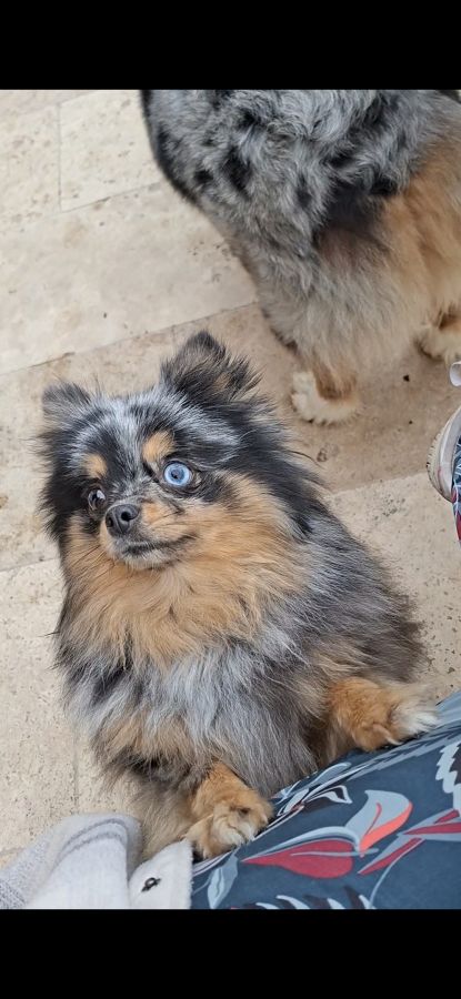 C'est une jeune spitz de 2 ans , couleur merle et tan donc non LOF. Elle est de taille petite et pèse 4,5kg ( elle est en surpoid d'un kilo 😅 c'est une petite gourmande )