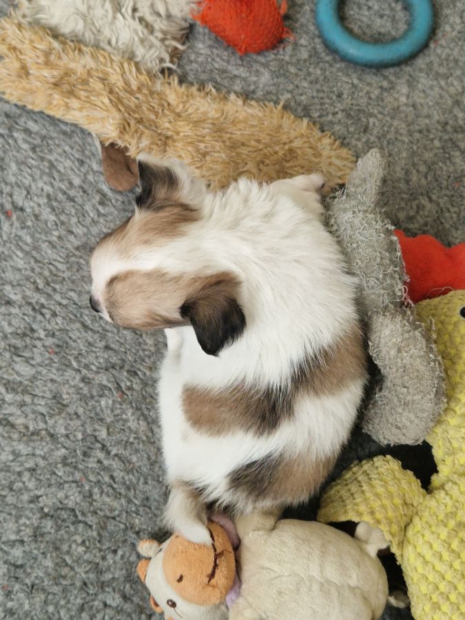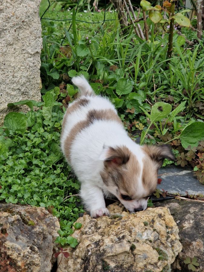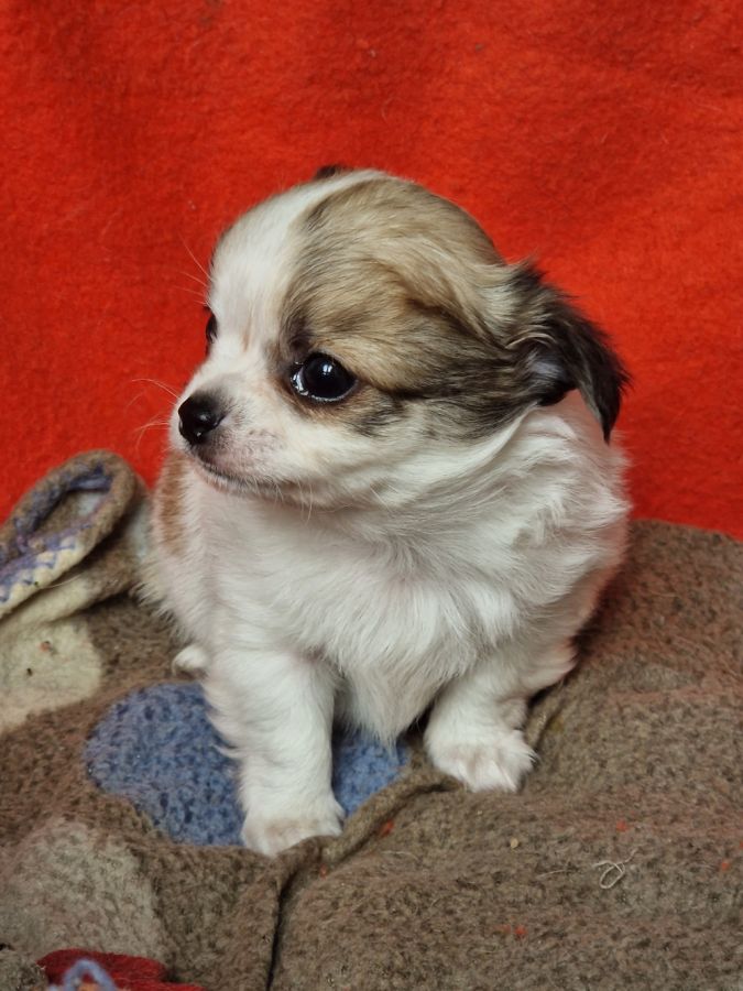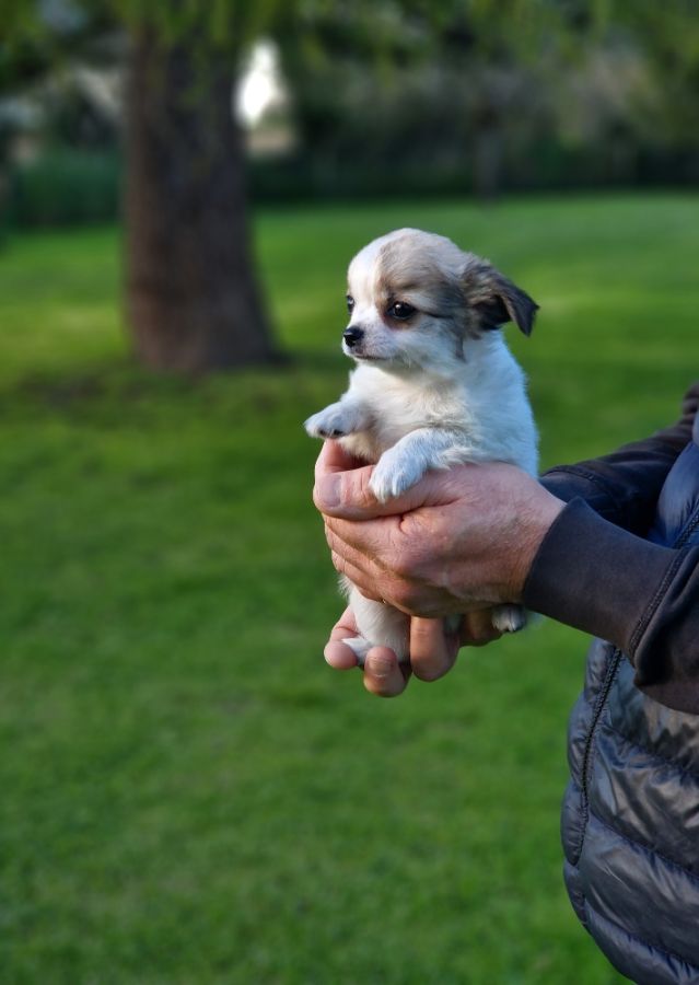 Disponible à partir du 25 mars, adorable petit mâle chihuahua blanc et fauve à poils longs, très bien typé, non inscrit au lof, né le 20 janvier 2026.
