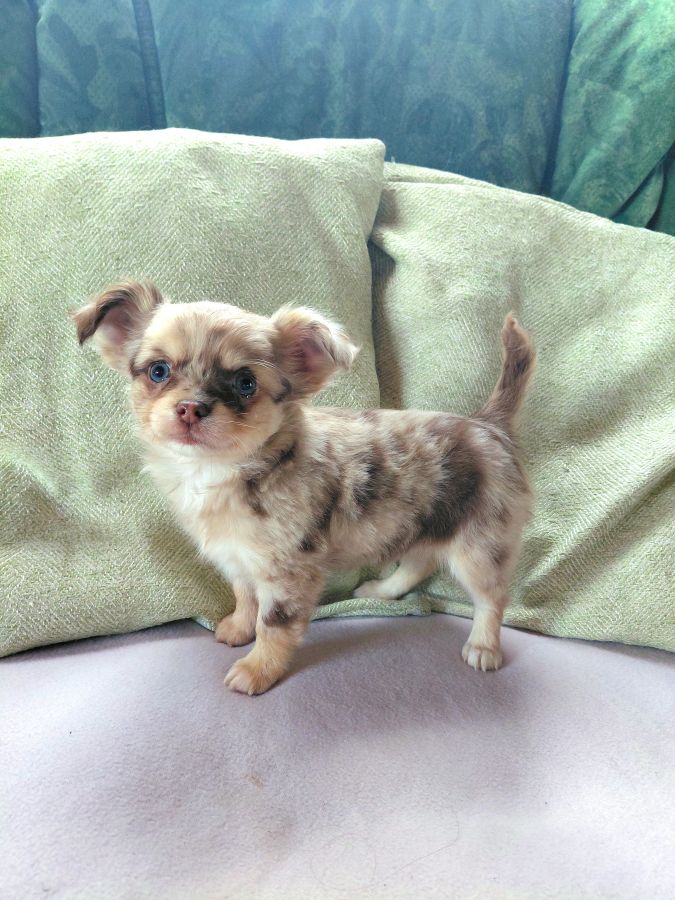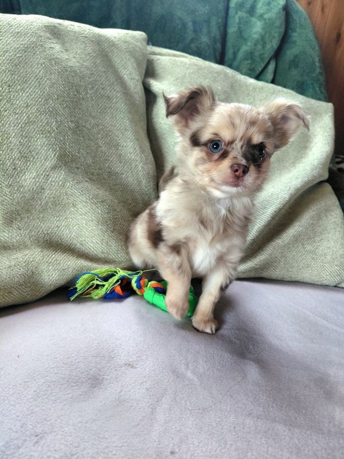 Bonjour, je vous presente Benji. Un joli petit mâle chihuahua à poils longs de robe merle choco. Il est mignon comme tout, il joue bien. Il est pucé, vacciné, vermifugé et a son certificat de bonne santé.