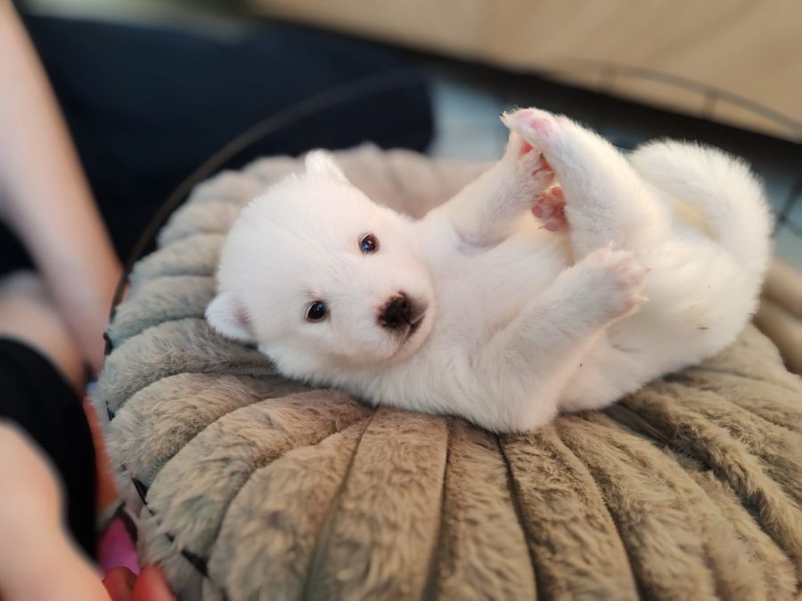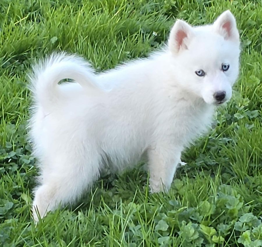 Chiot type pomsky mâle poil polaire blanc yeux ble