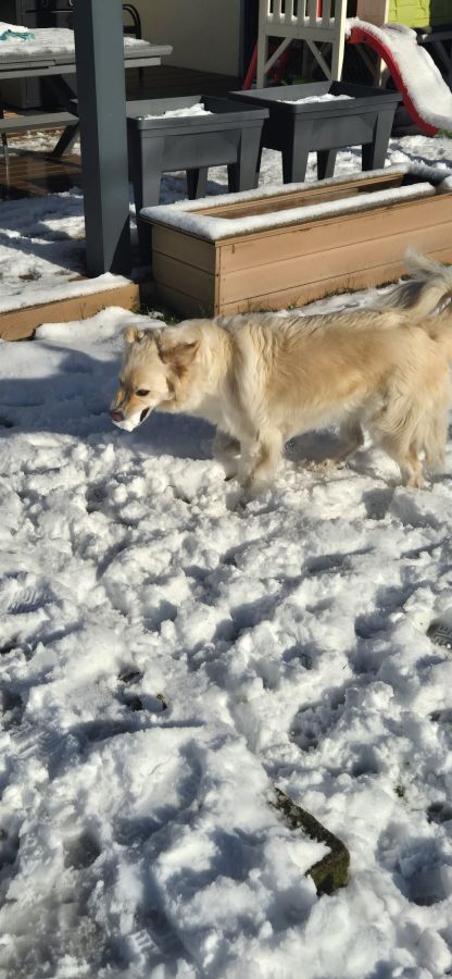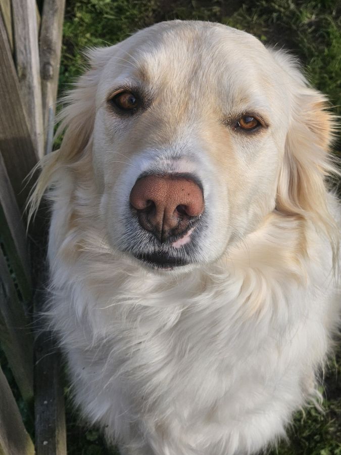 Olympe est issu d'une mère Patou pur race et d'un père Golden (suspicion sans confirmation), elle va avoir 3 ans, elle pèse 36kg, elle est dépendante affective dû au fait que M. ne pouvait pas s'occuper d'elle comme il se doit. Après bilan d'un comportementaliste animal il lui faudrait au moins 2h de balade par jour et la présence de l'humain le plus possible.