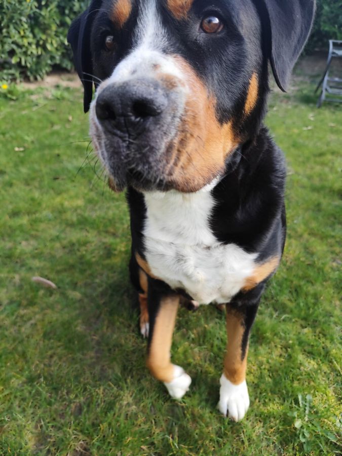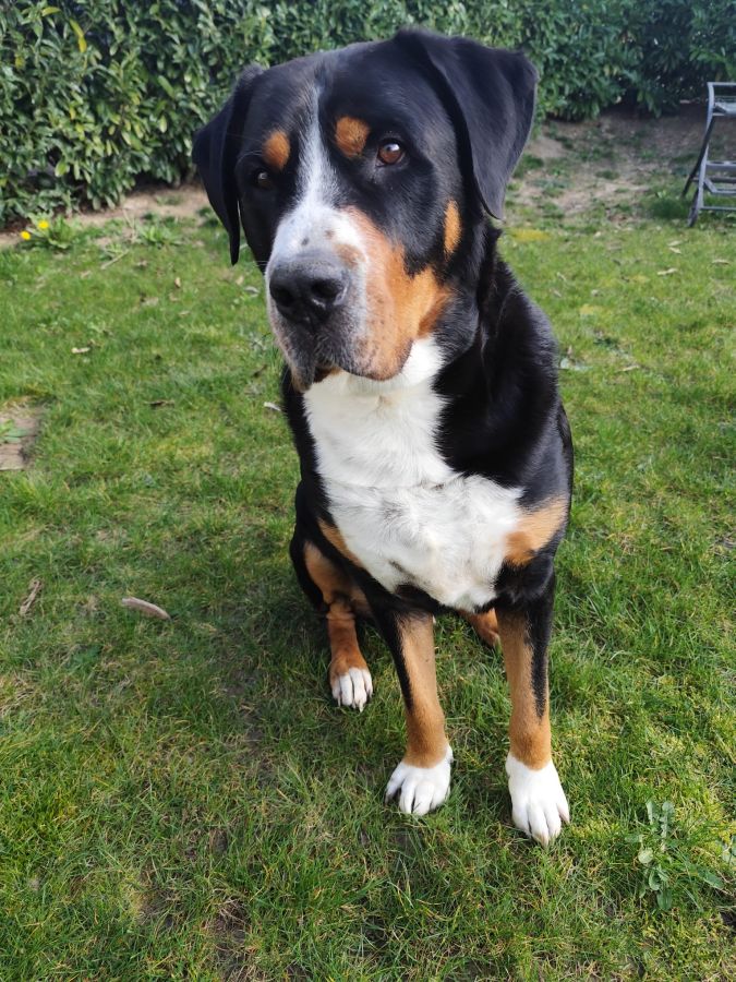 Nous recherchons une famille d’accueil pour MADRASS âgé de 5 ans et demi, notre magnifique Grand Bouvier Suisse LOF (pure race), né le 5 juillet 2020. Avec ses 60 kg et sa robe tricolore noire, blanche et marron, c’est un chien qui attire tous les regards par sa beauté et sa douceur.