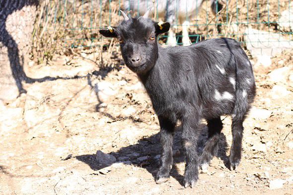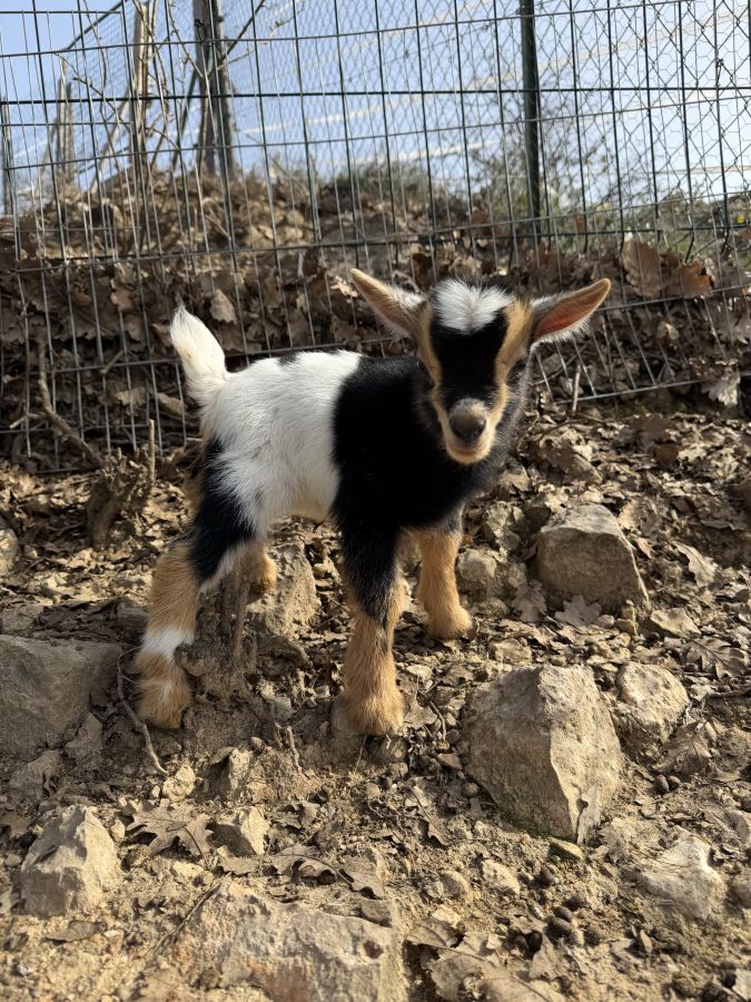 Un bouc de 3 ans couleur herminé (toise autour des 40-45cm au garrot, une chèvre noire pie qui va avoir 2 ans (toise autour des 38cm au garrot) ainsi que sa petite chevrette qui sera de petit gabarit.