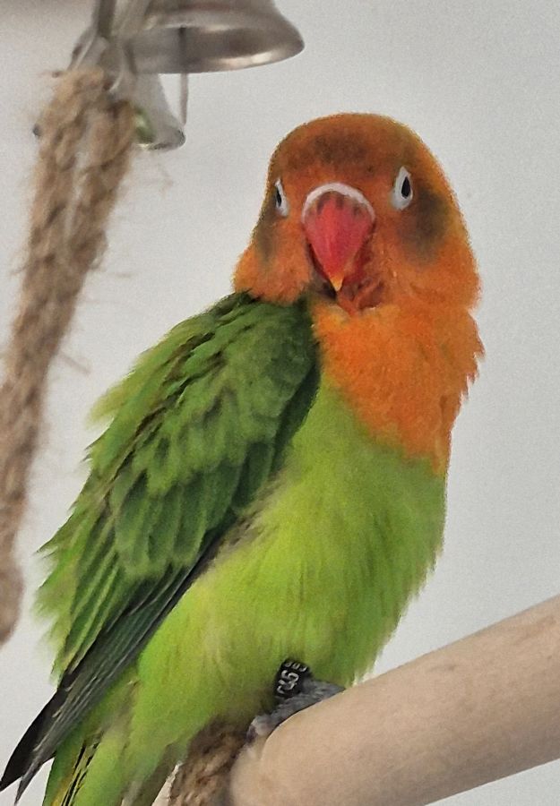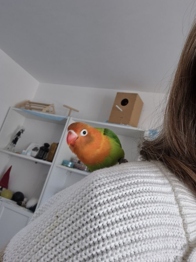 Reste un peu méfiant mais vient sur le bras ,aime se cacher dans les cheveux, et picorer dans les assiettes.