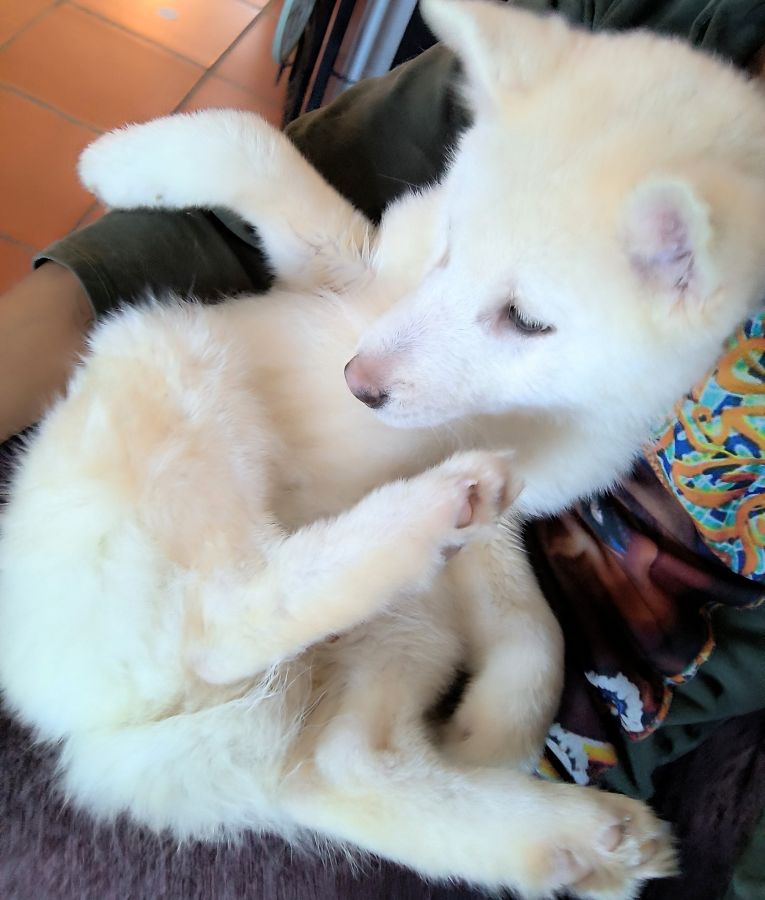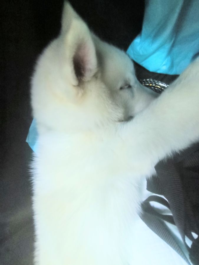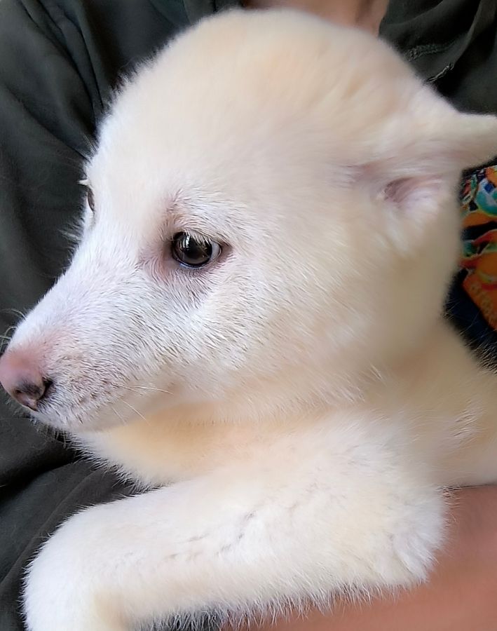 Très beau véritable chiot Pomsky au pelage blanc crème, avec un léger masque de Husky qui lui donne une très jolie expression.
