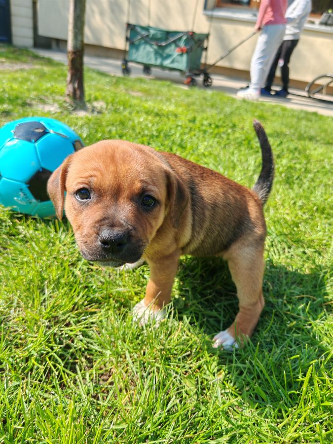Blue : Une superbe chienne à la robe bicolors : , rouge et bringé, magnifiquement rehaussée par des pattes blanches.