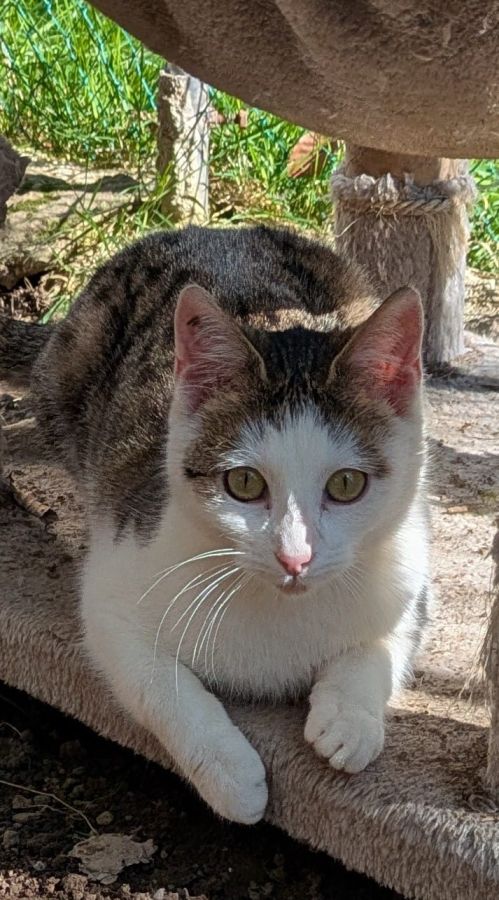 Sécotine est une petite chatte tigrée brun (spotted tabby) et blanche d'environ 1 an