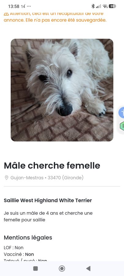 Annonce n°171419 publiée le 01/04/2026 Gujan-Mestras • 33470 • GirondeSaillie West Highland White Terrier