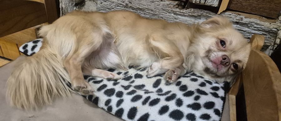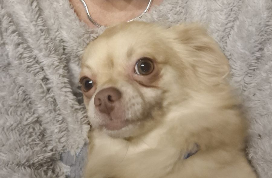 Chihuahua mâle à poils longs type chihuahua (n’appartient pas à une race), âgé de 17 mois, couleur sable.