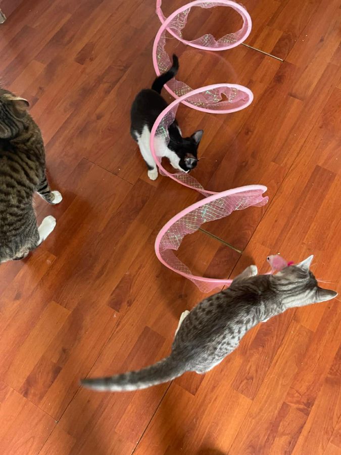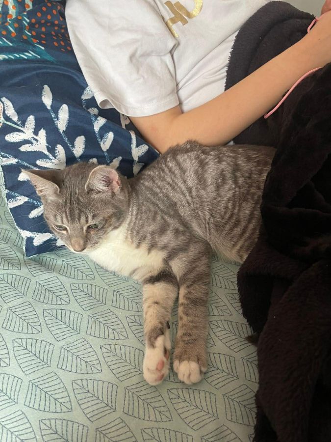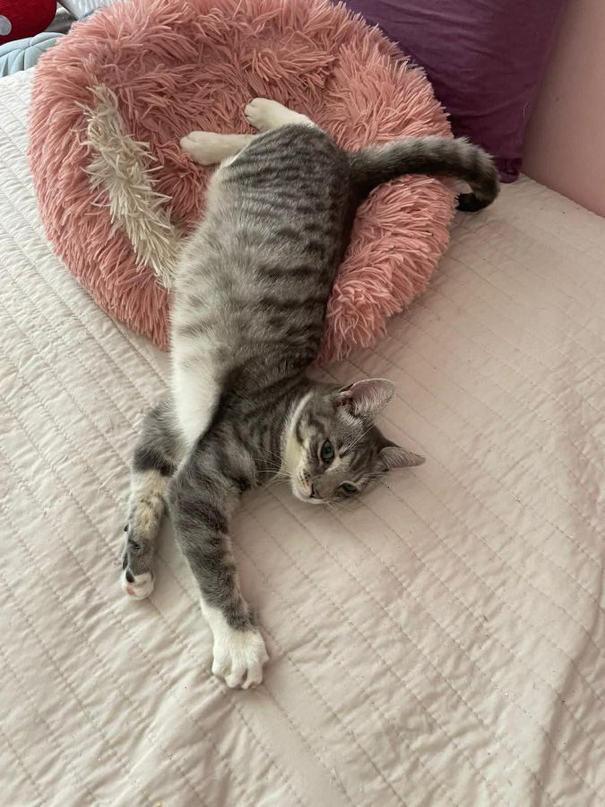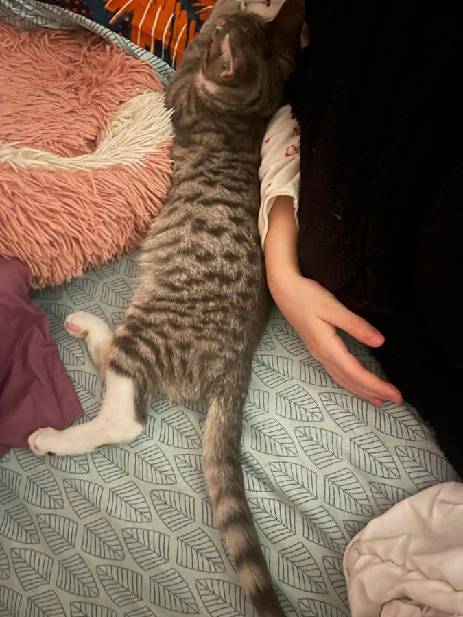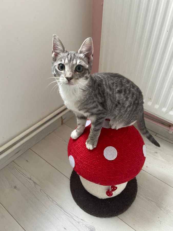 Assia a 5 mois et c’est une adorable petite minette pleine de joie de vivre. La vie lui a laissé une petite particularité : bébé, un fort coryza lui a causé une légère ataxie. Résultat ? Assia a une petite démarche un peu chaloupée et, quand elle court trop vite, il peut lui arriver de perdre l’équilibre comme un petit chaton maladroit. Mais pour elle, ce n’est absolument pas un problème : Assia vit sa vie de chat à 100 %. Elle joue, grimpe, explore et descend très bien d’un lit. Les grands sauts ne sont simplement pas sa spécialité… mais son charme, lui, est inégalable. C’est une chatonne vive, drôle et très joueuse qui adore la compagnie des autres chats. Sa façon de proposer une partie de jeu ? Leur sauter sur le cou pour les provoquer gentiment ! Les plus jeunes acceptent souvent avec enthousiasme, et les plus âgés lui rappellent parfois qu’ils préfèrent la sieste… ce qu’elle respecte (plus ou moins).