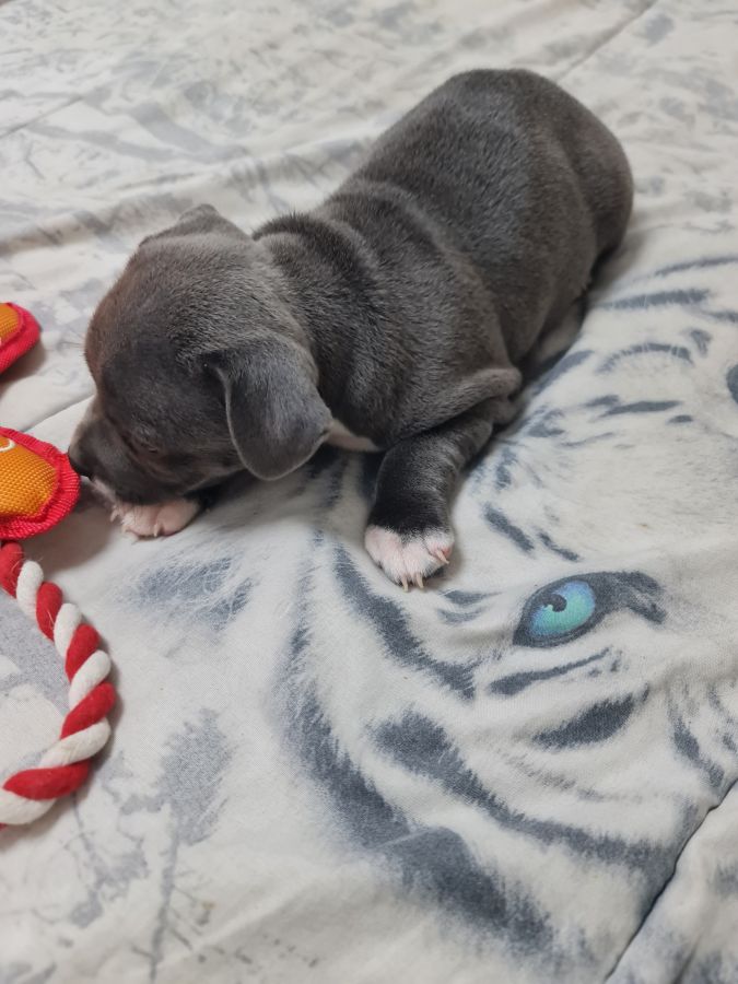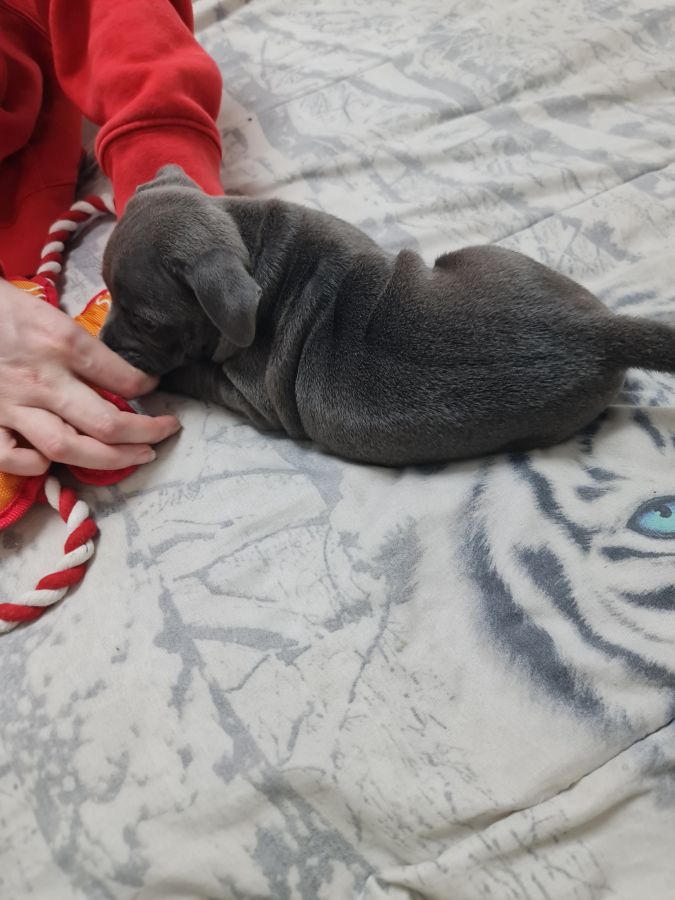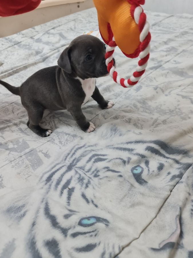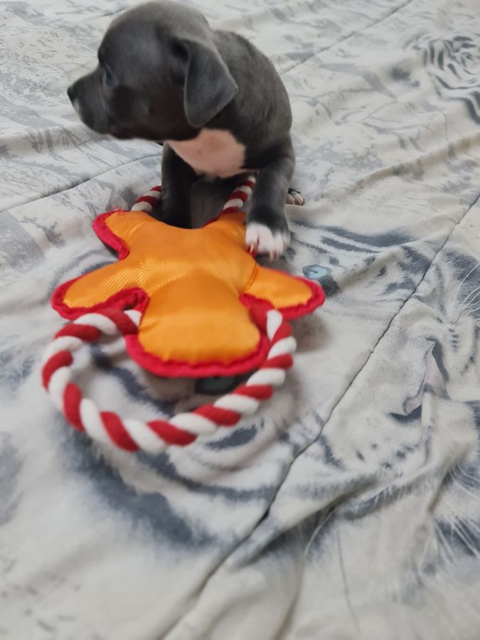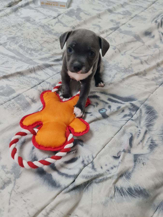 Magnifique petite femelle staffie bleu et blanche lof disponible de suite, portée de 3 chiots,super caractère non dominante, joyeuse, habituée aux bruits de la maison et autres animaux, née le 26/01/2026, puçée,vaccinée, vermifugée, pedigree en main, parents porteurs sains avec fiche génétique, testés L2HGA HC et ADN, passeport santé, certificat de bonne santé joint, pour plus d'infos me joindre au 06 67 67 14 36 pas sérieux s'abstenir merci