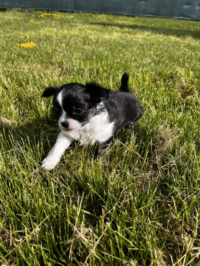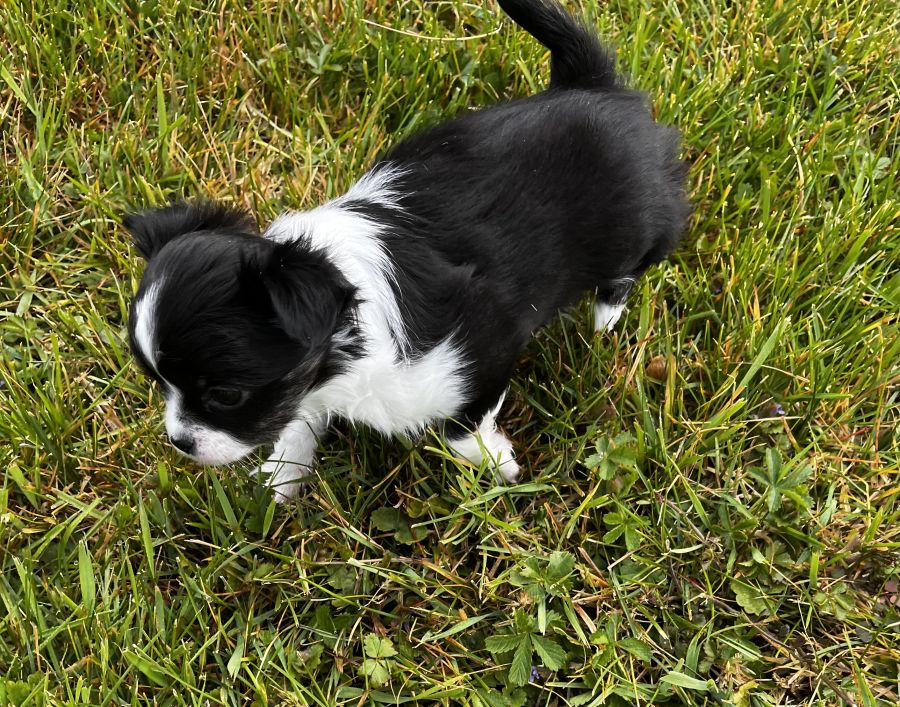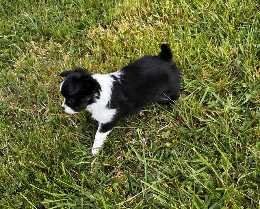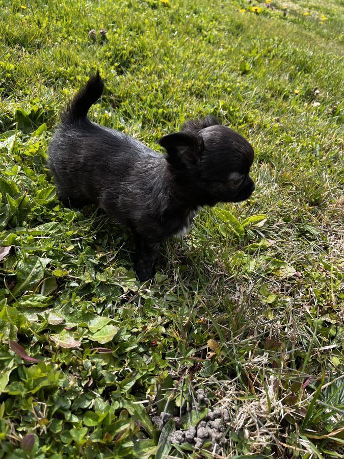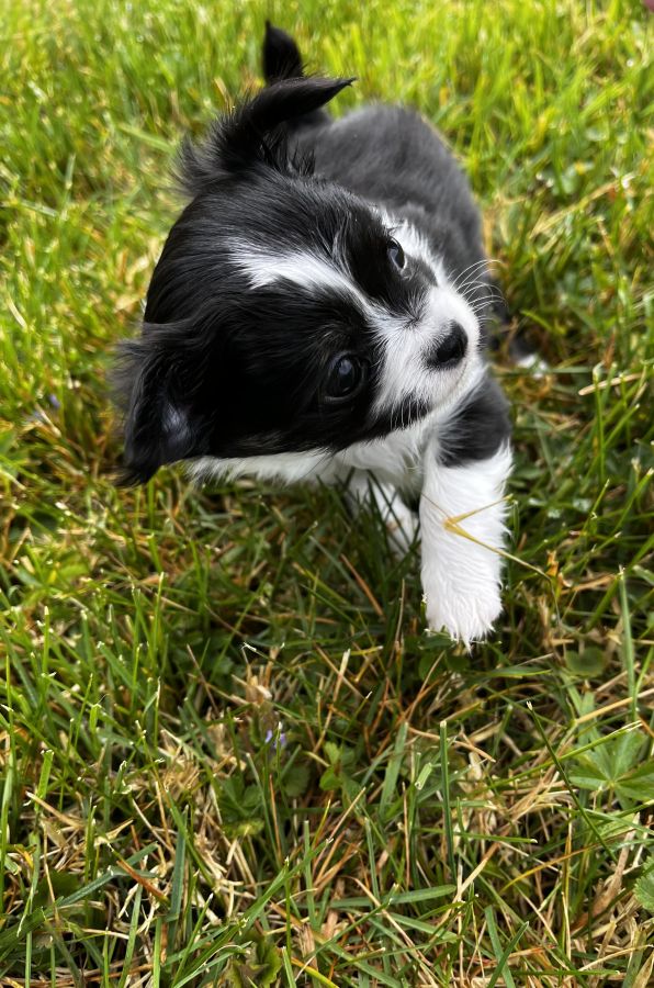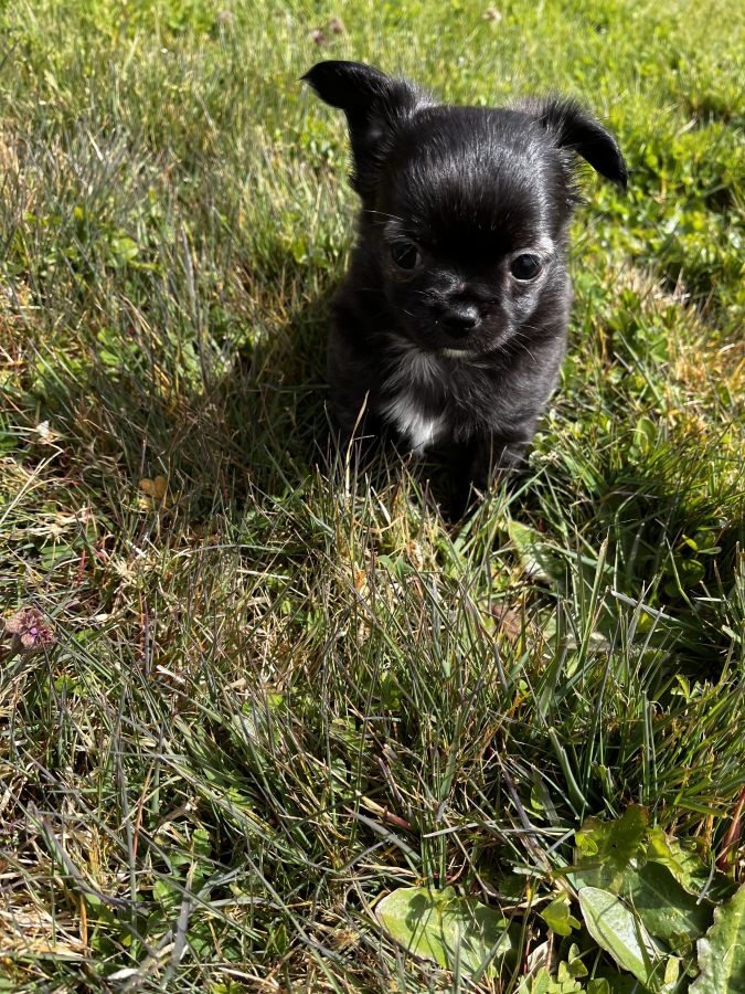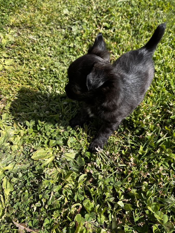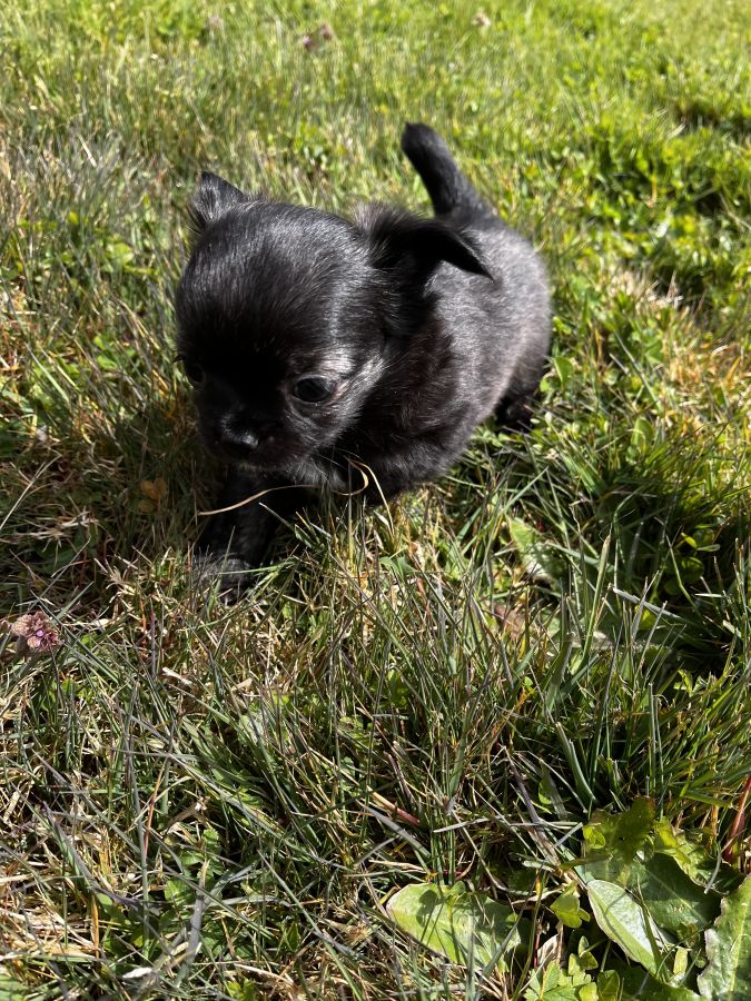 💫Baya petite femelle noire panache de blanc, du bringée arrive sur ses pattes arrière. Elle est câline, un brin coquine et oui c’est une fille 🤣 Son prix est de 2400 euros.