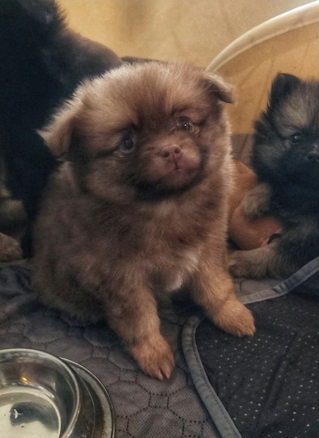 Nous mettons à la réservation Brooklyn, Brownie et Bijou, 3 femelles Chocolat et 1 Charbonnée type Pomsky. Elles sont nées le 17 Février 2026 et ont des noms provisoires