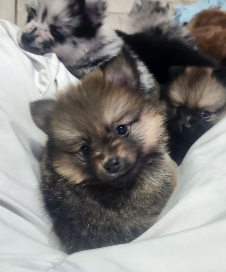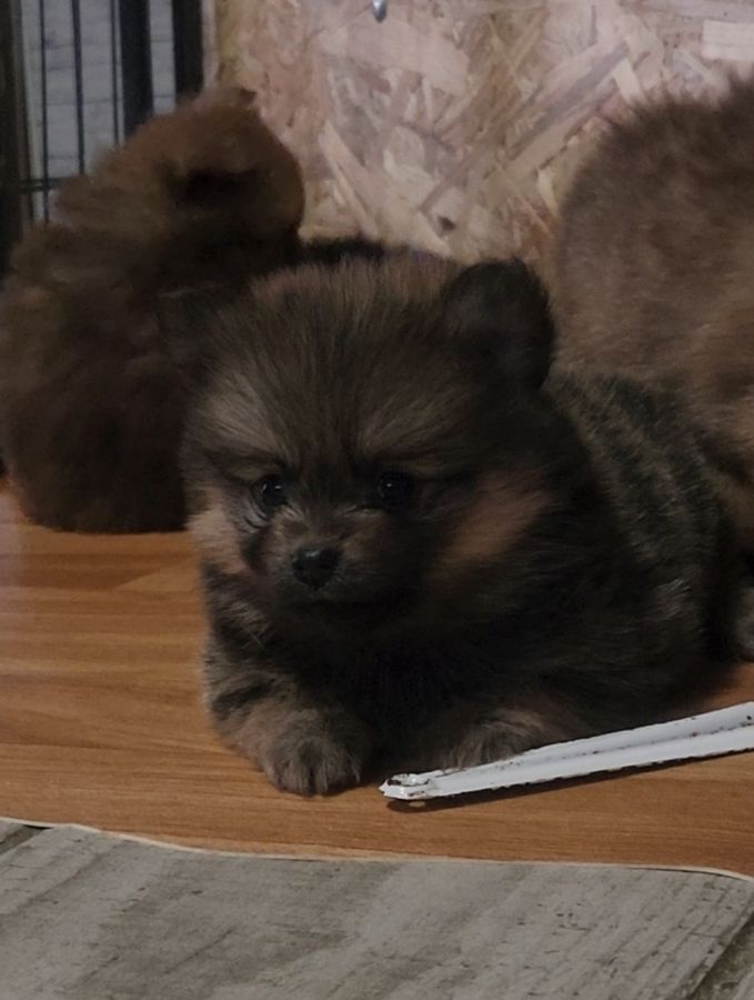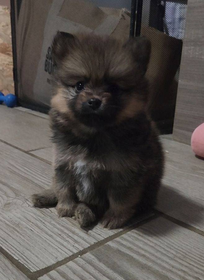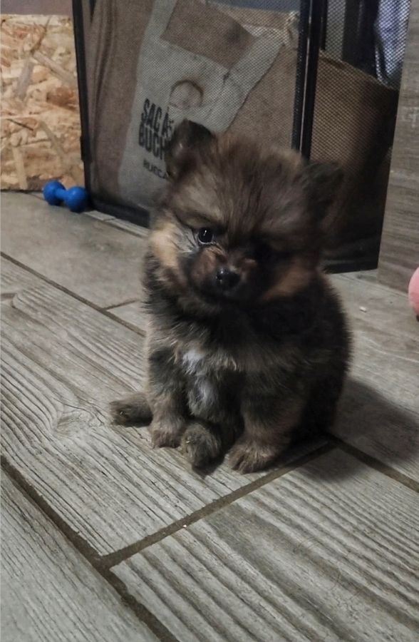 Nous mettons à la réservation Biscotte, 1 Charbonnée type Pomsky. Elle est né le 17 Février 2026 et a un nom provisoire.