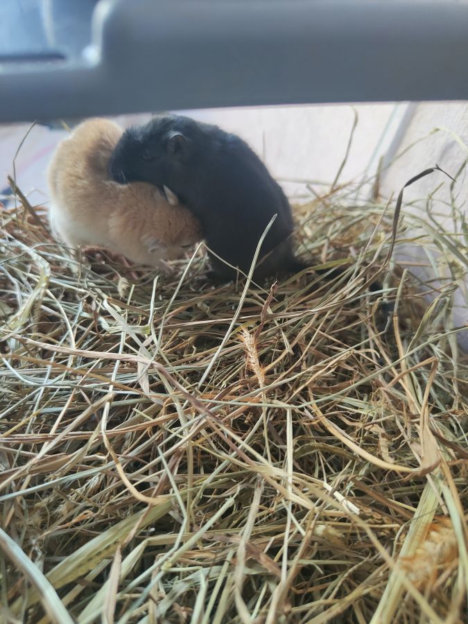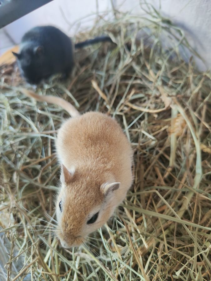 Mignonnes comme tout, elles sont gentilles et attentionnées, nous sommes tristes de devoir nous en séparer mais nous n'avons pas assez de place pour garder Palomino (beige clair) et Balzane (noir) et les bébés gerbilles femelles.