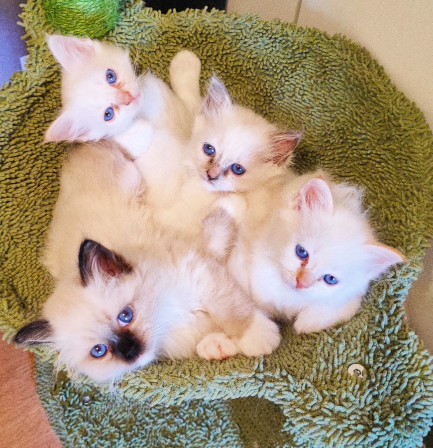 Il y a des mâles red, seal et blue et une femelle blue tortie.