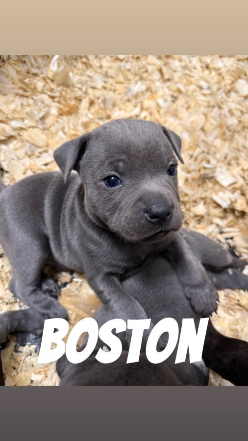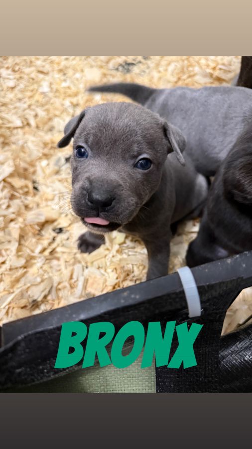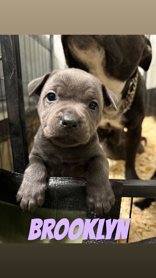 Bonjour, je propose 3 chiots staffie bleu dispo à la réservation, élevés avec autres chien et chat