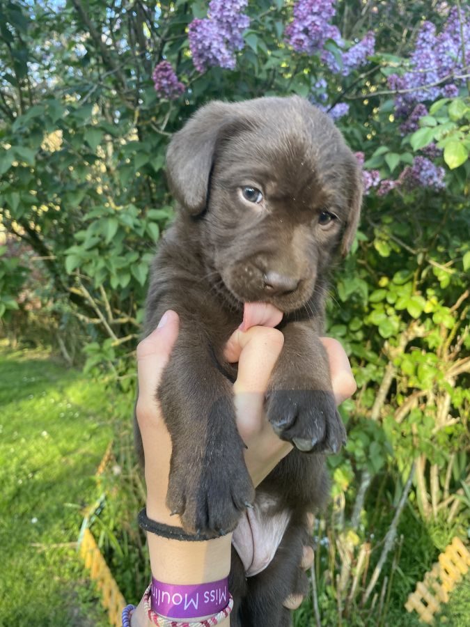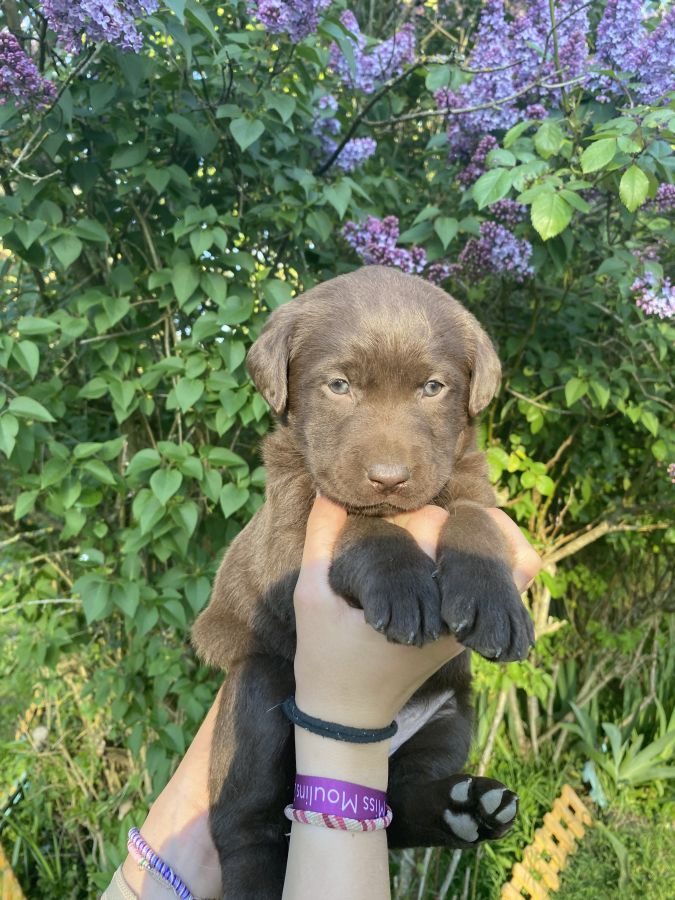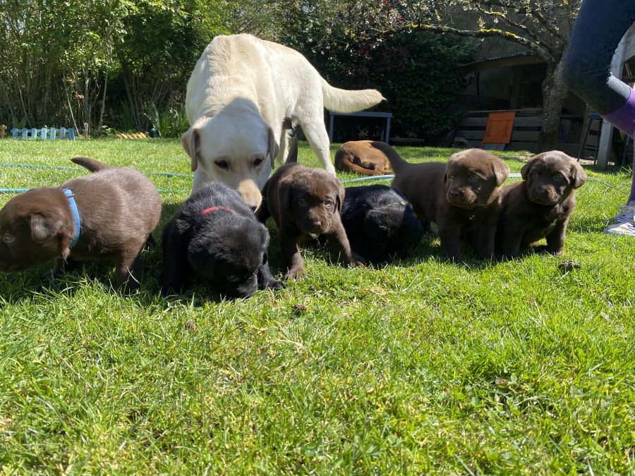 Chiots labradors chocolats et noirs, élevés en famille