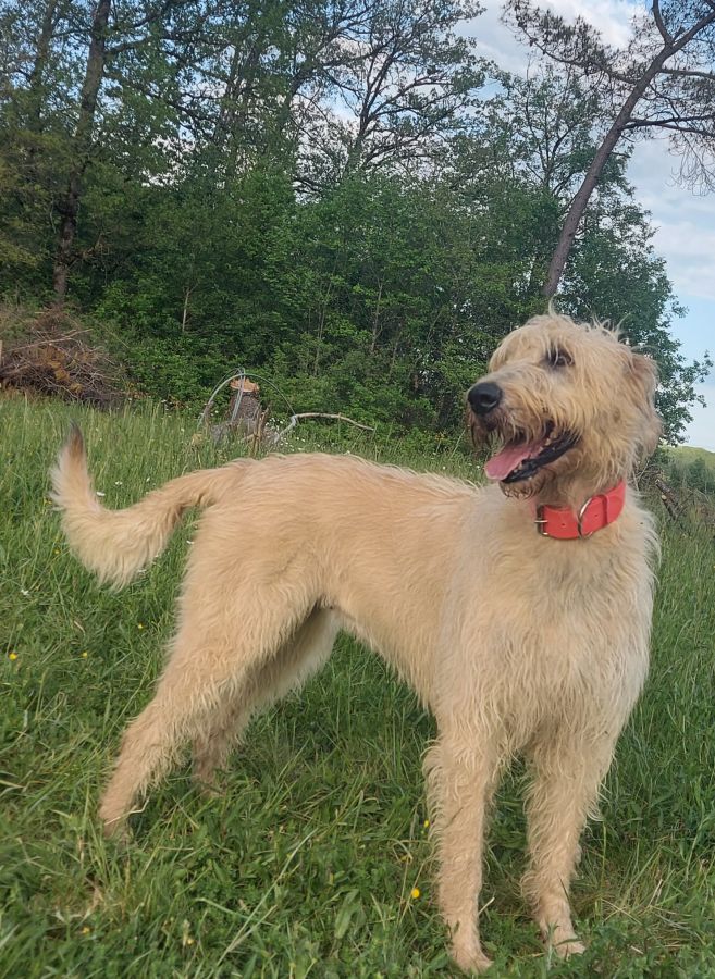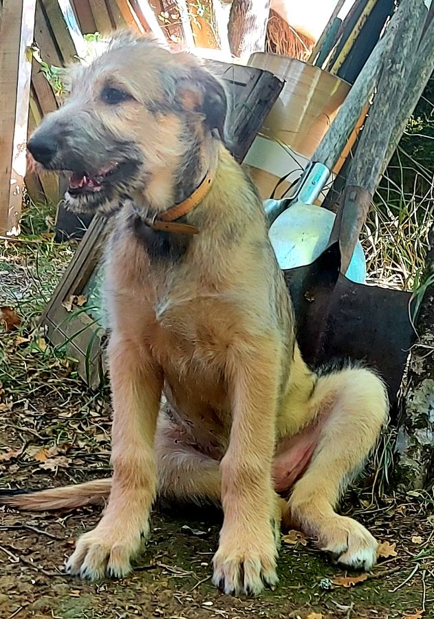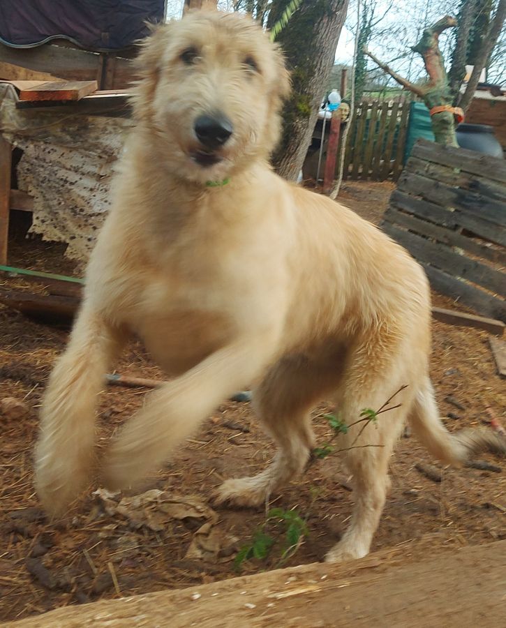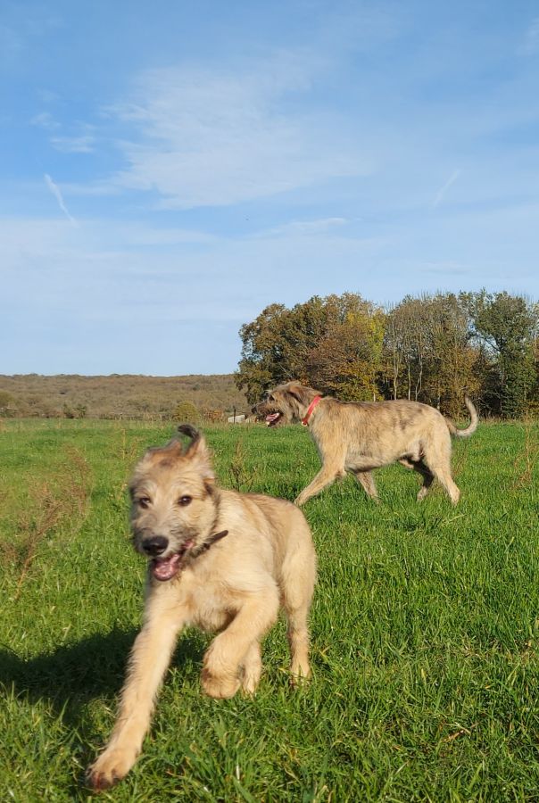 jeune chienne irish wolfhound de 8 mois de couleur fauve clair et inscrite au LOF . Pucée , vaccinée et nourris au BARF depuis ses premiers repas , elle éclate de santé .