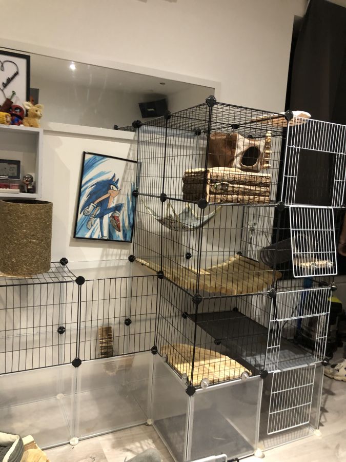 la cage est complete : biberon, gamelle, cabane, hamac ect...