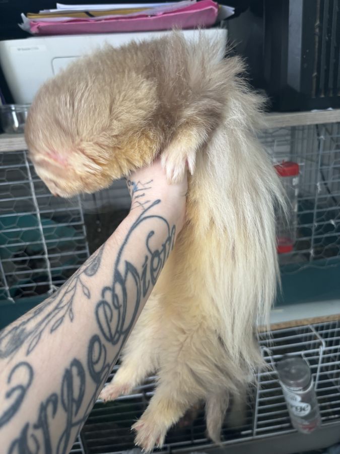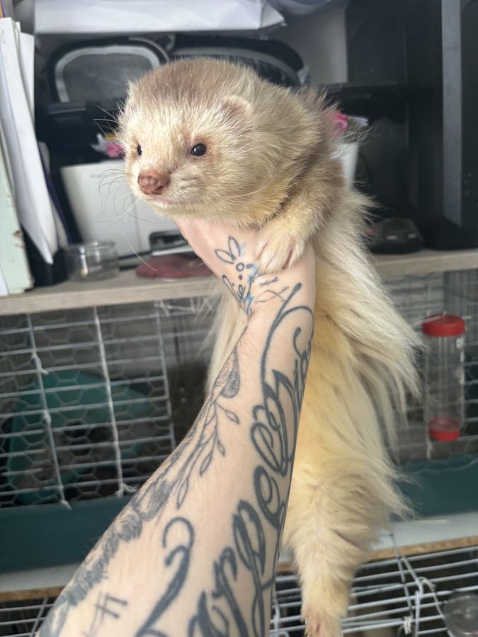 Loulou est un adorable furet de 5 ans arlequin Silver angora, habitué aux enfants aux chiens et aux chats, aime vivre en liberté.
