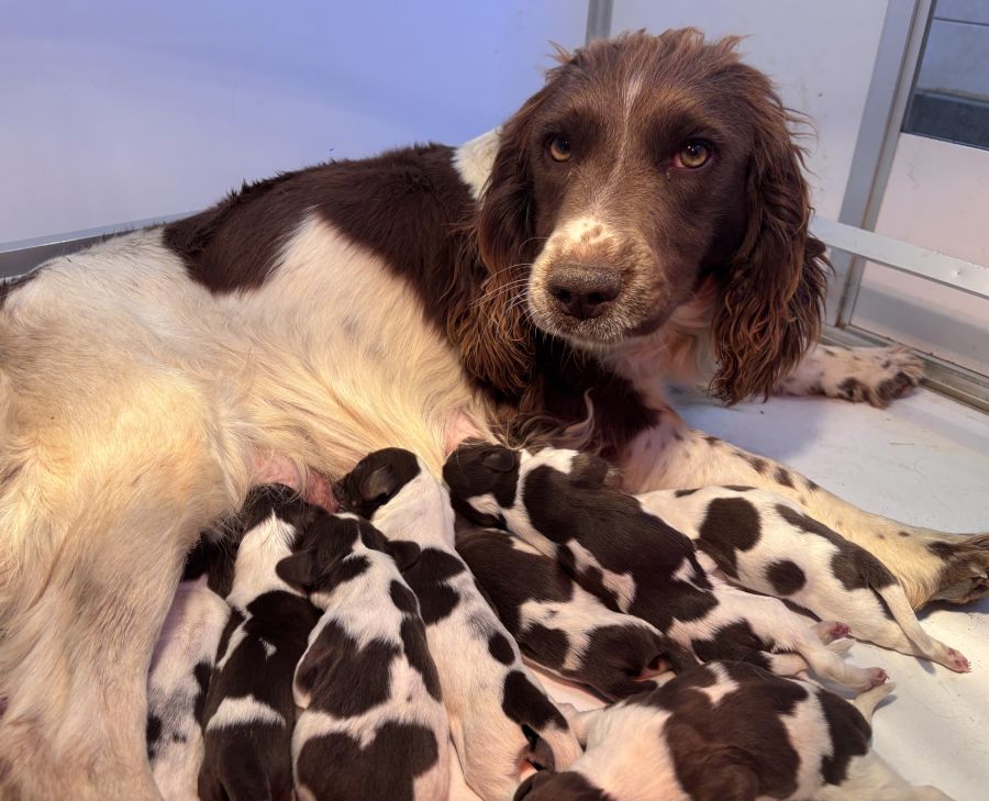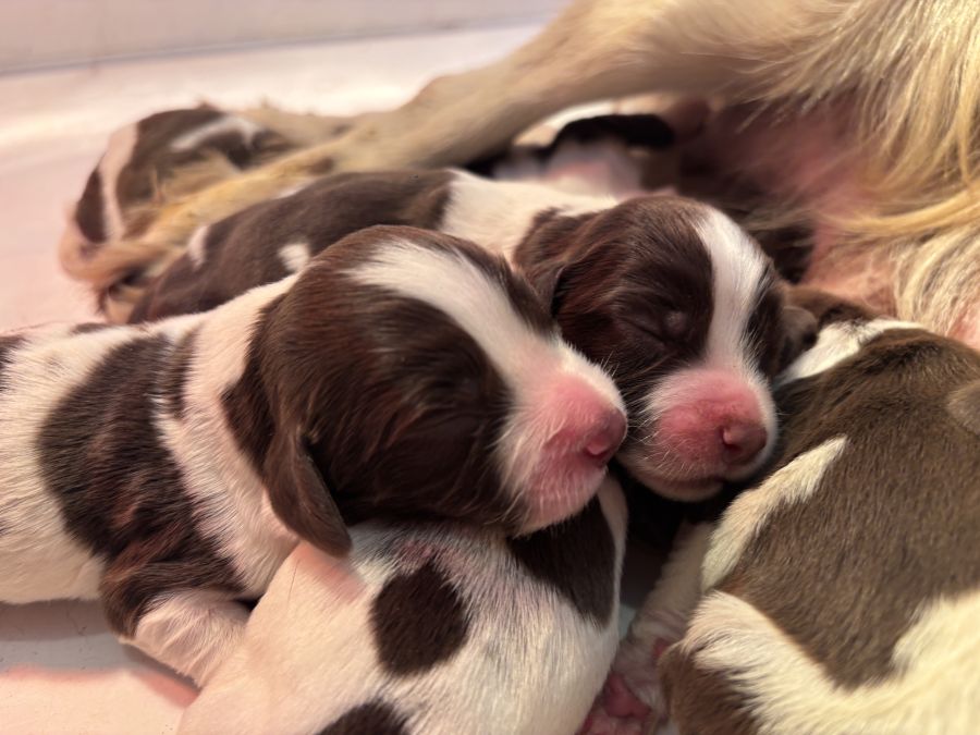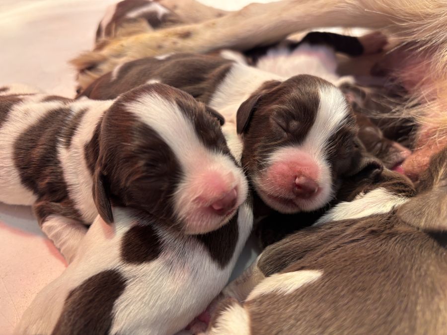 Belle portée de 9 chiots, 3 femelles et 6 mâles. Tous marron panaché de blanc.