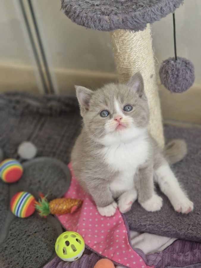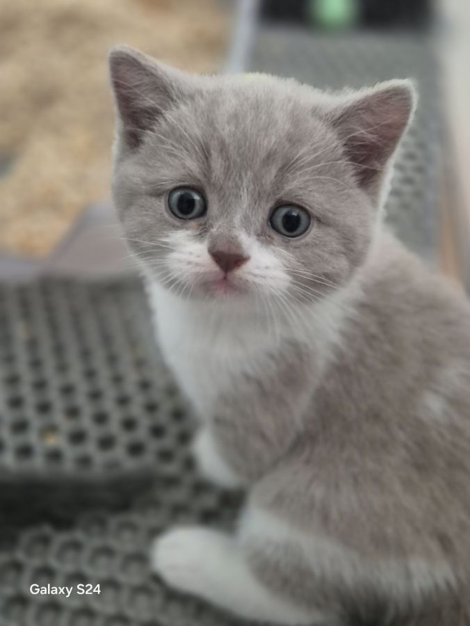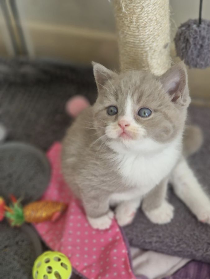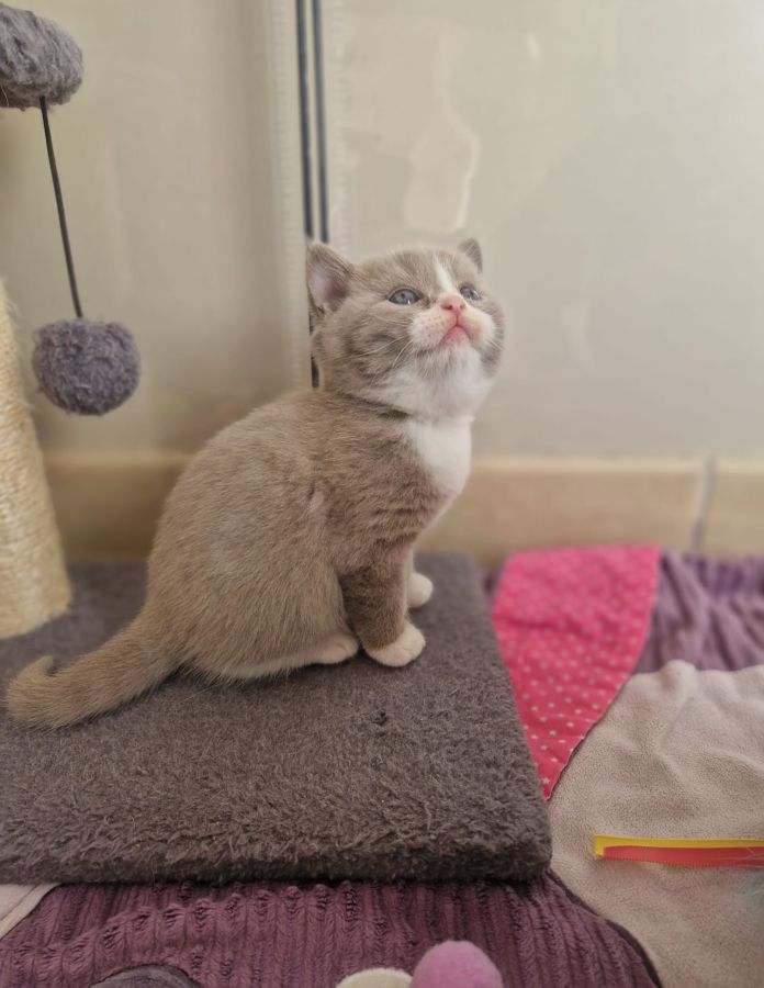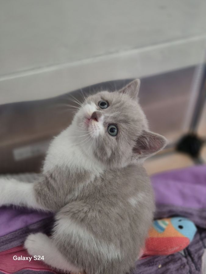 Il est né le 22/02/2026 5 chatons d'une maman Scottish Straight bleue et blanche et d'un papa British Shorthair lilas et blanc.