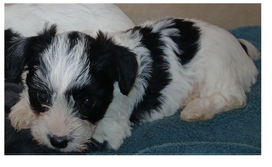 Robe noire et blanche, hypoallergénique, ne perd pas de poils mais nécessite toilettage.