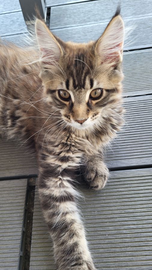 Vend chaton Maine Coon, disponible de suite (3 mois), vacciné, puce électronique, vermifugé. Elevé en famille.