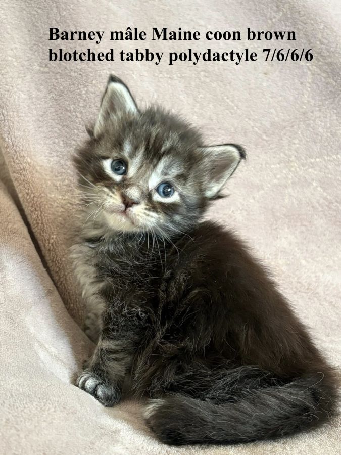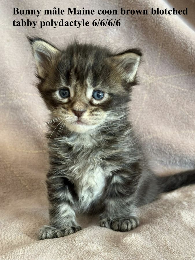 Disponibles à la réservation 4 chatons maine coon mâles dont certains polydactyles nés le 24/03/2026 d’une portée de 4 chatons.