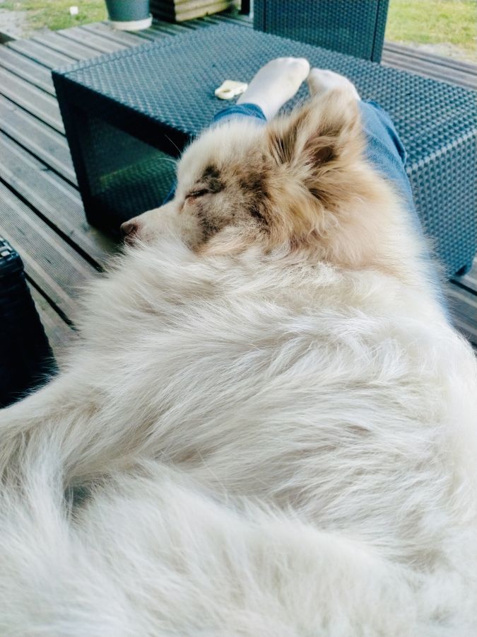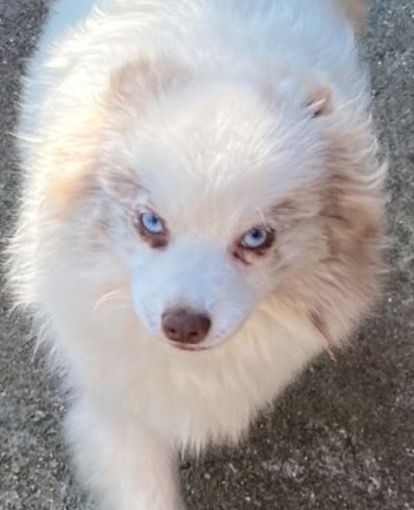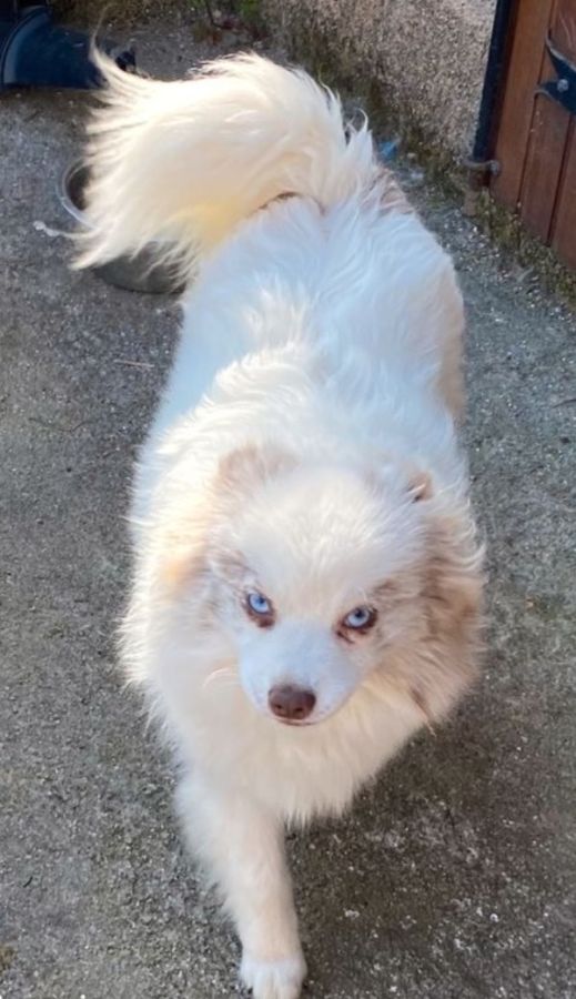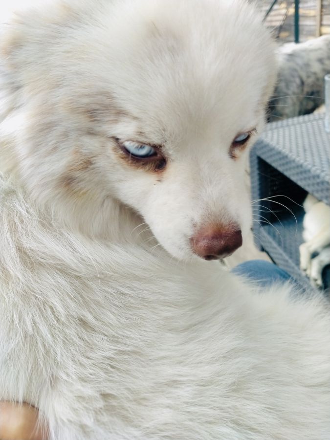 le domaine des p’tites pattes vous propose Artemis Pomsky de taille mini 6,5 kg pour 32cm poils wooly chocolat merle aux yeux bleus ciel de 4 ans.