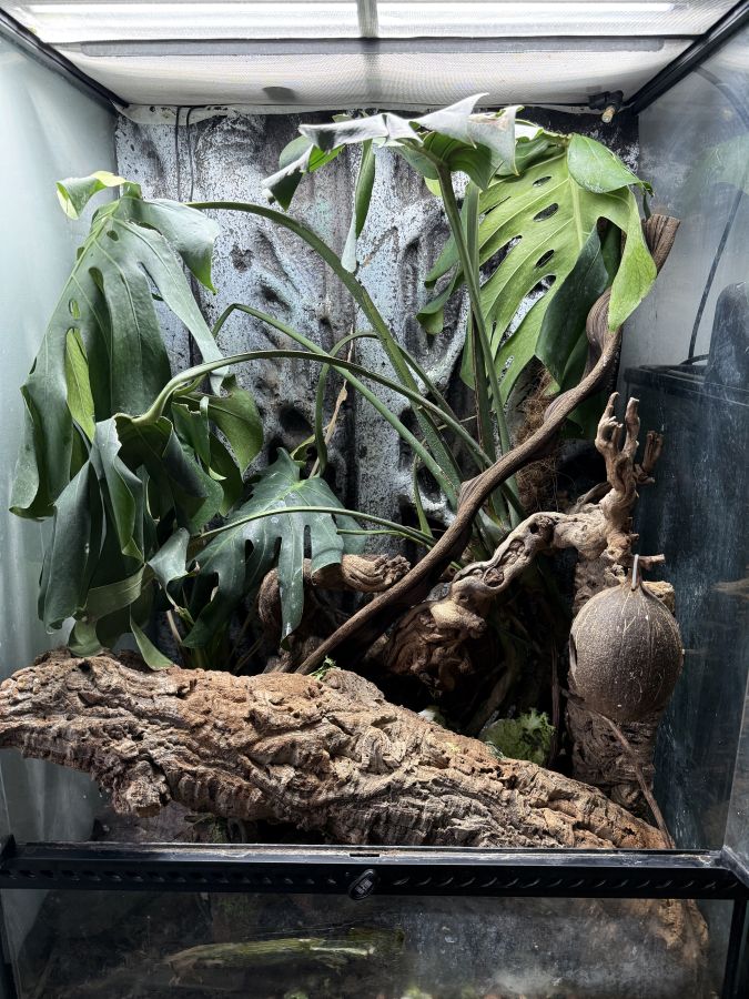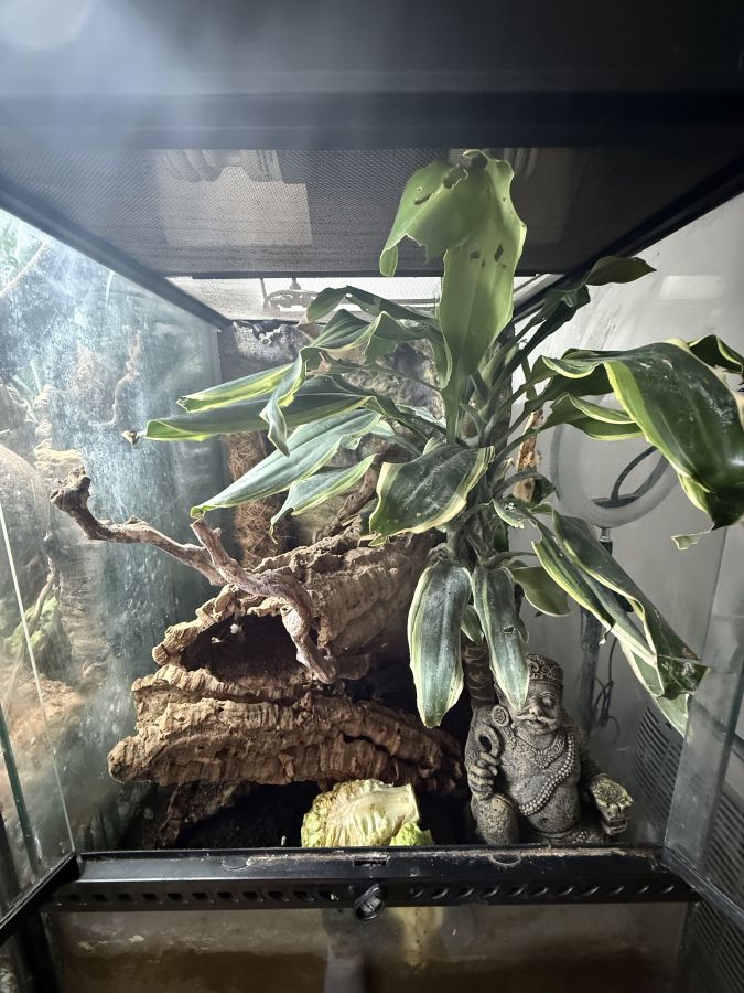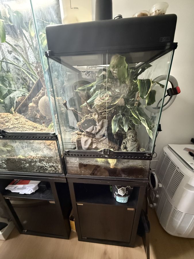 Matériel: 1 terrarium (60*45*90) avec son meuble, 1 terrarium (45*45*60) avec son meubles, system d’irrigation automatique, socle éclairage, cloportes bien intégré dans la terre, plantes, bois,…