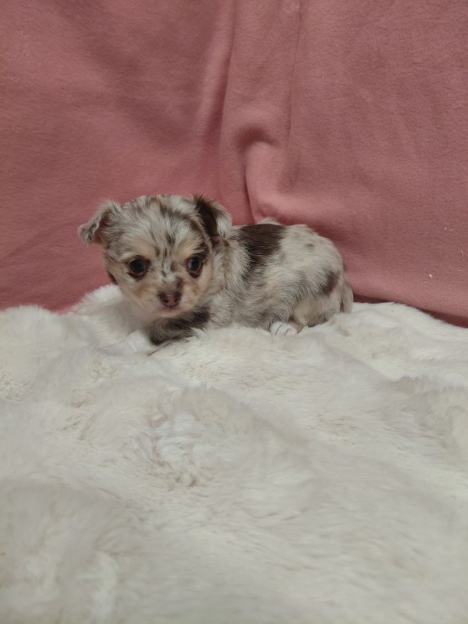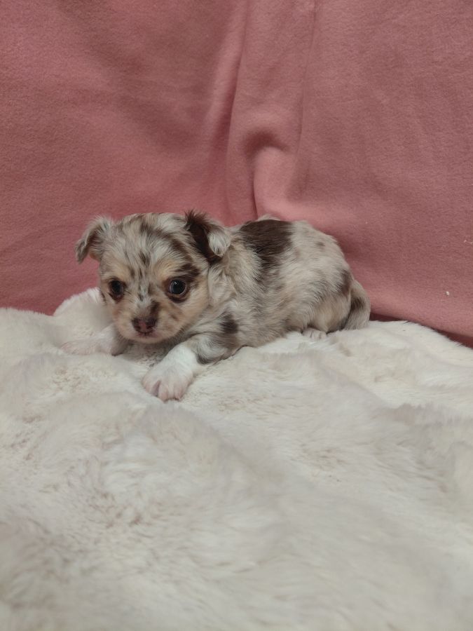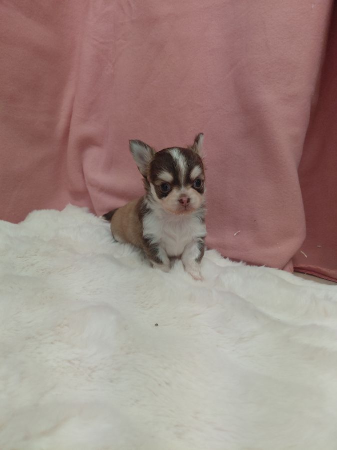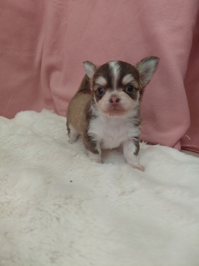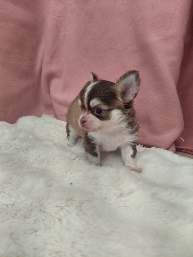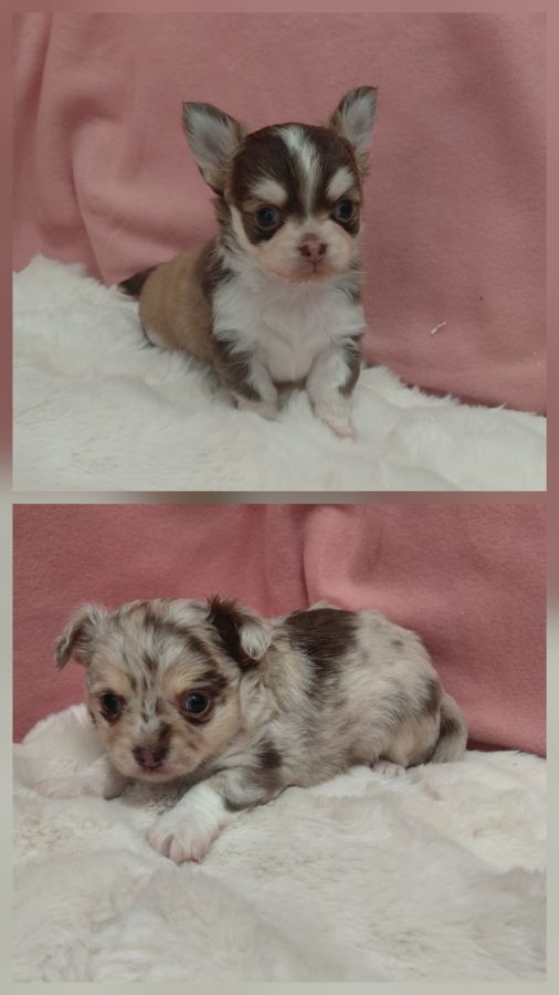 Bonjour, voici 2 petits mâles chihuahua à poils longs. Un merle chocolat et un chocolat et blanc avec masque husky. Ils sont nés le 23 mars. Ils seront pucés, vaccinés, vermifugés et auront un certificat de bonne santé à leurs 2 mois. Ils seront sociabilisés et habitués à beaucoup de choses.