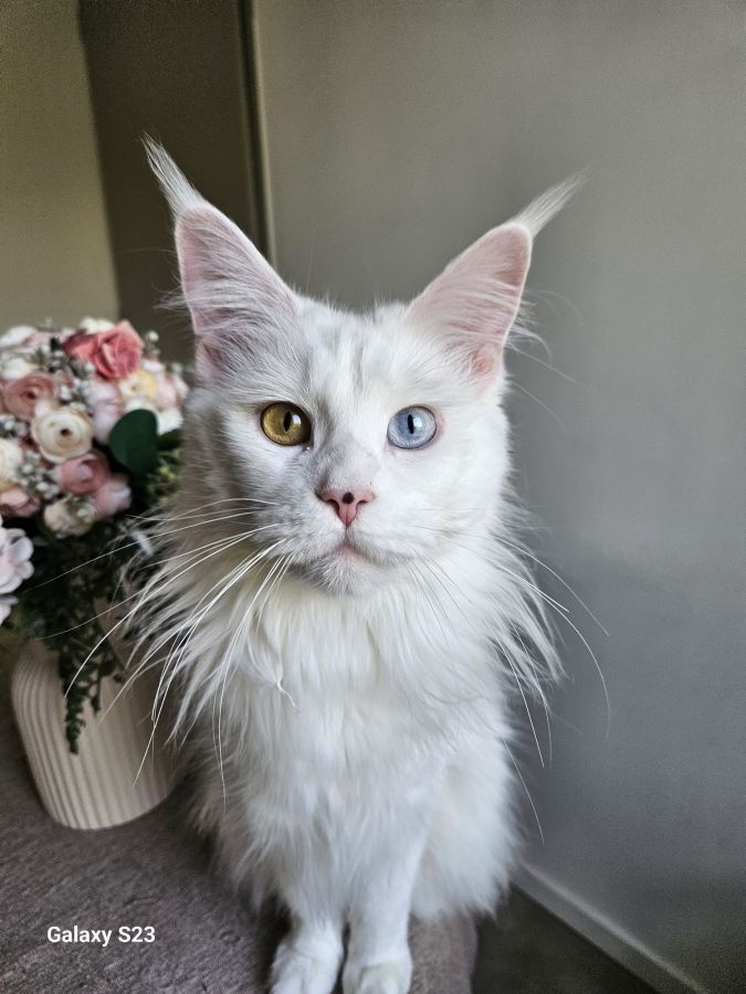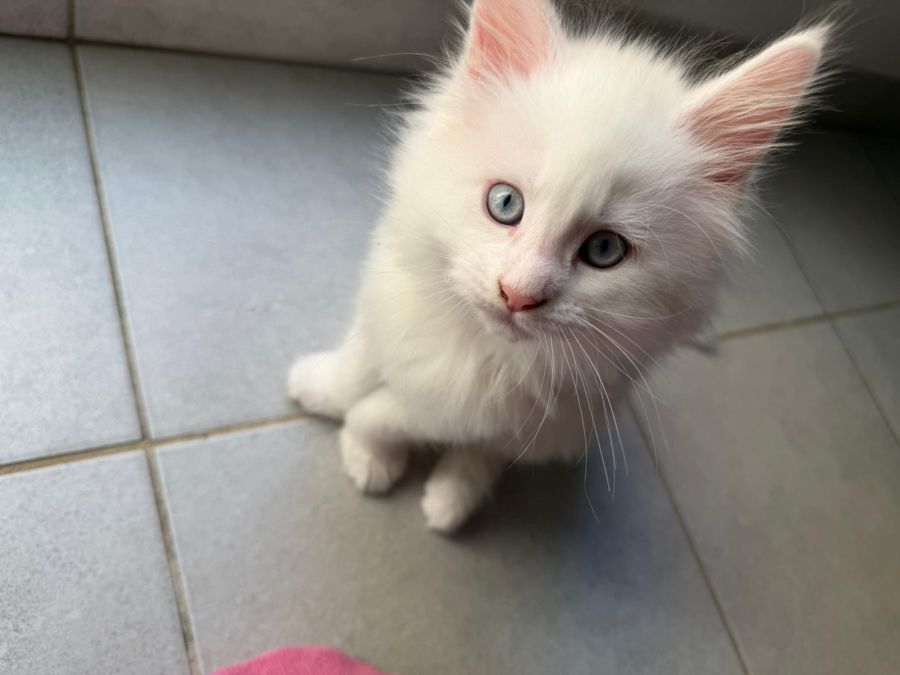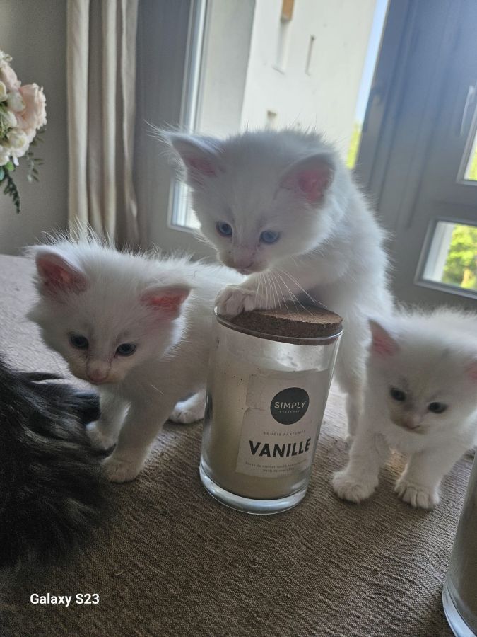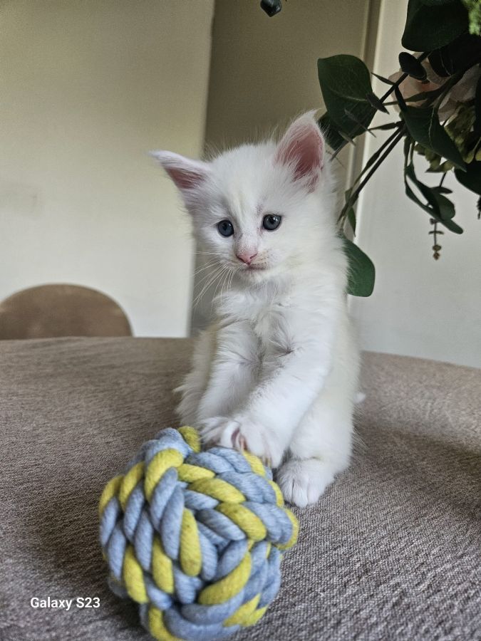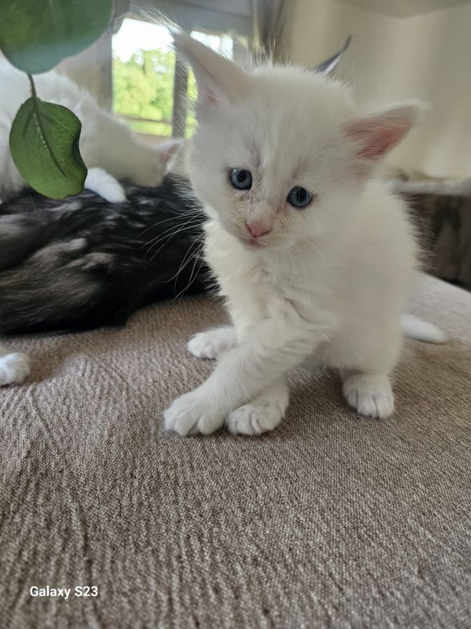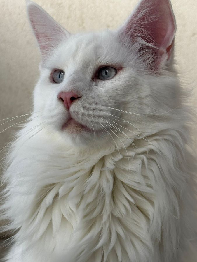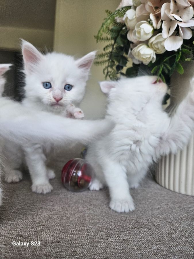5 chatons maine coon tous blancs, il y a 1 blanc aux yeux bleus, 1 blanc au yeux noisette et 1 blancs aux yeux vairons. Il y a également 1 femelle yeux bleus et 1 yeux vairons. Ils sont nés le 15/03/26.