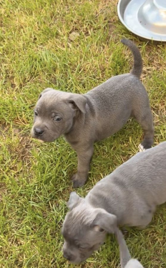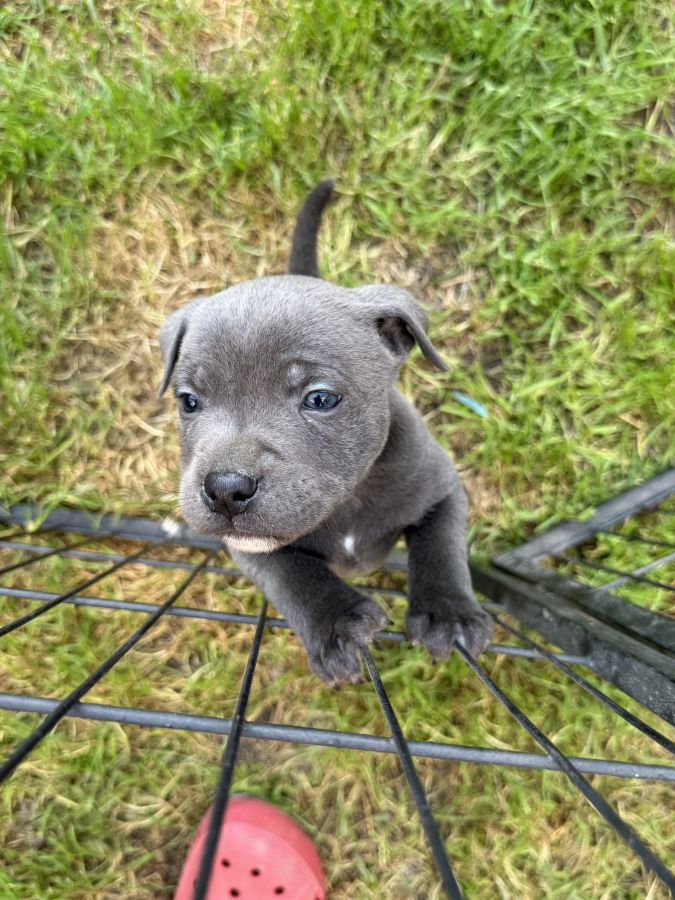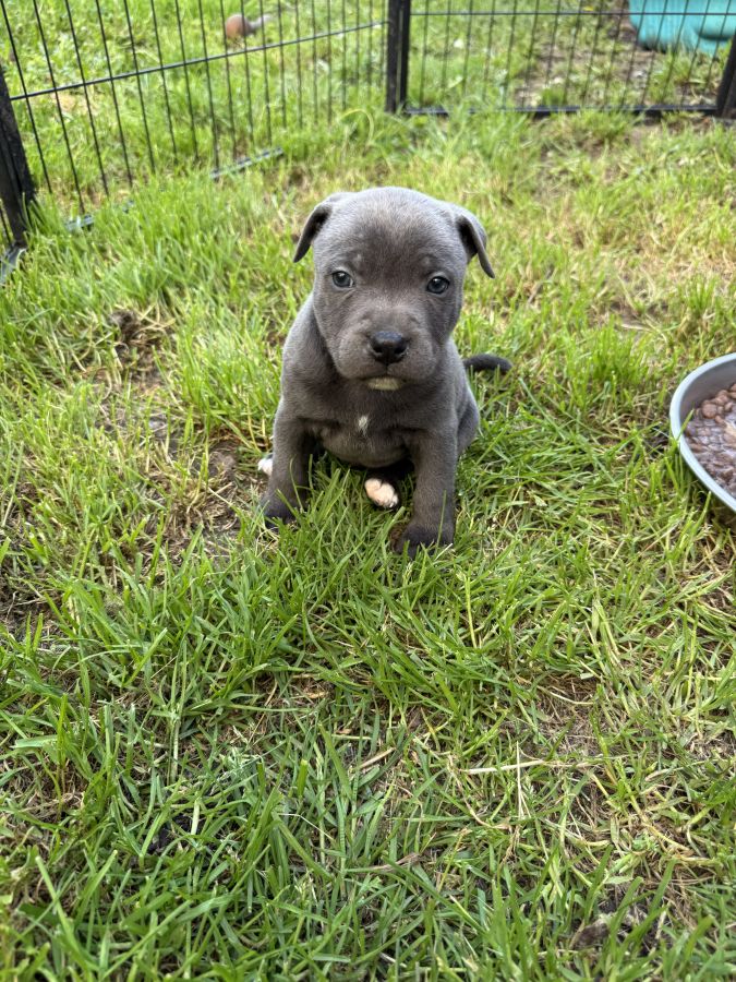 1 chiot male bleu avec un peu de blanc sous la mâchoire et sur une des pattes