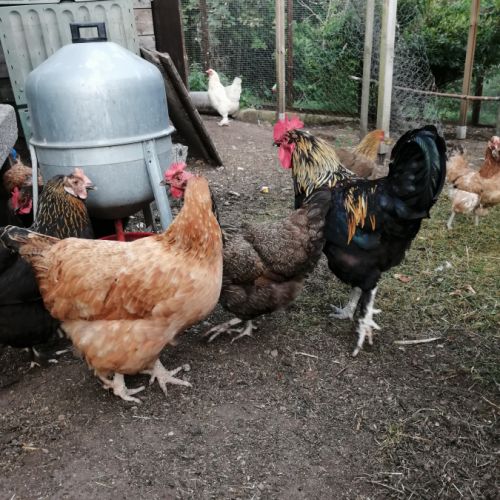 4 poules de race noire de Janzé d'un an, une jeune poule de 6 mois ainsi qu'une poule rousse pondeuse. Les poules de Janzé mangent les frelons asiatiques ainsi que les punaises....
