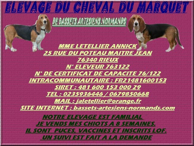 SIREN : 481600153 / Eleveur Rieux • 76340 • Seine-MaritimeEleveur familial et professionnel de bassets artésiens normands. Cette élevage est une passion. Mes chiens sont élevés en famille. Pour moi un chien n'a pas la place au chenil, De vivre à nos cotés ne lui enlève pas son instinct de chasseur. Les chiens savent faire la part des choses quand il faut aller à la chasse ils ne rechignent pas et sont tout contents et apprécient les canapés, fauteuils et la chaleur du foyer. Je ne chasse pas mais pour le plaisir de mes chiens je les entraine à la chasse aux lapins et je participe à de nombreux brevets de chasse ou nous avons des résultats et d'expositions de beauté. Nous avons trois champions internationaux de beauté à travers Aramis du cheval du marquet, son frère Chivas du cheval du marquet et sa soeur Doubaï du cheval du marquet. Tous mes chiens sont issus d'une lignée que j'affectionnais tout particulièrement celle des hameaux de gennetuit qui a su produire des chiens avec des caractères en OR. N'hésitez pas à rendre visite à mon élevage ou vous verrez tous nos 4 pattes soit par mon site ou même directement chez nous