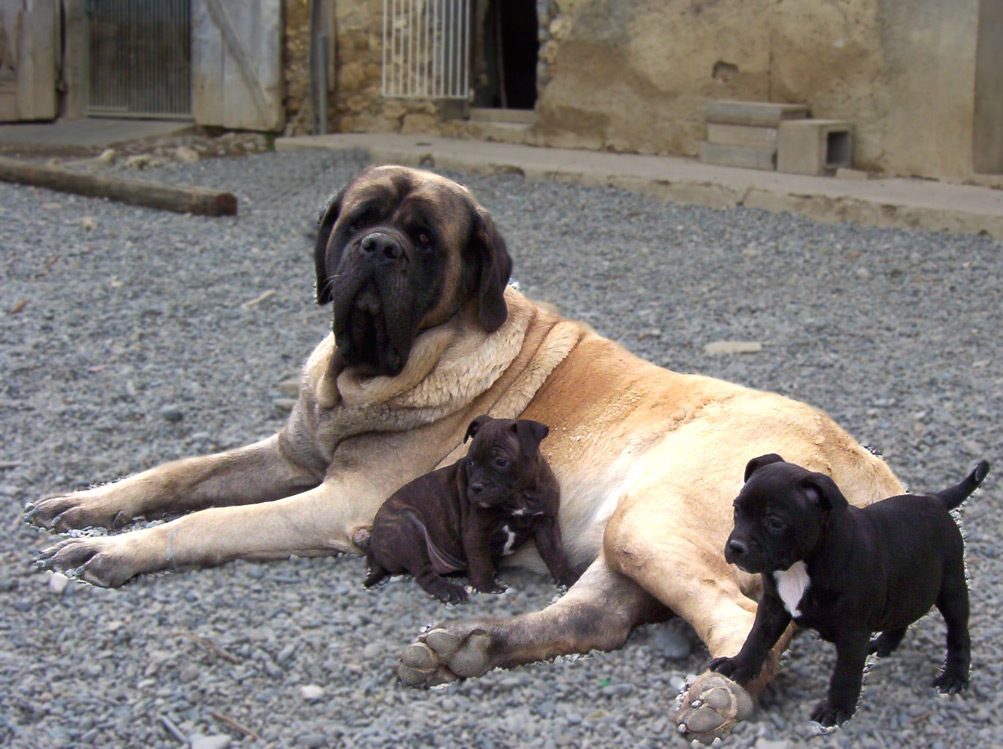On vit avec nos deux races de coeur : le Mastiff et le Staffie (staffordshire bull terrier) dans une vieille ferme sur deux hectares de terrain...