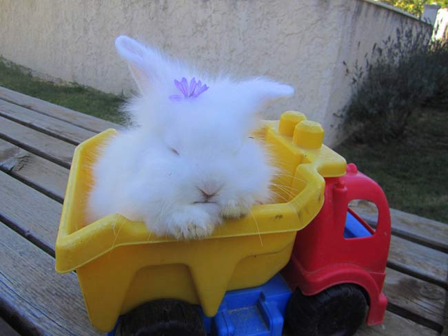 La mère est une bélier naine pecking teddy, couleur martre brun.