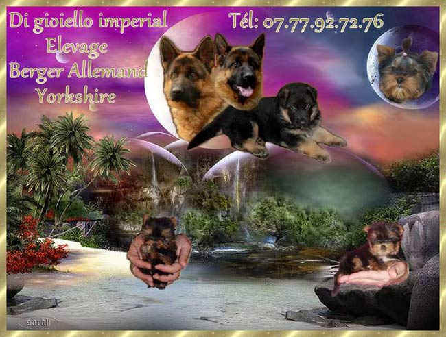 Di gioiello imperial. Élevage de yorkshire, berger allemand, oiseaux canaris + exotique en corse. Chiots pucés, vaccinés, inscrit au LOF, garanties légales contre les maladies + contre les vices cachés rédhibitoires. Facilités de paiements. Livraison par nous même de nos chiots yorkshire et chiots berger allemand sur région paca et paris