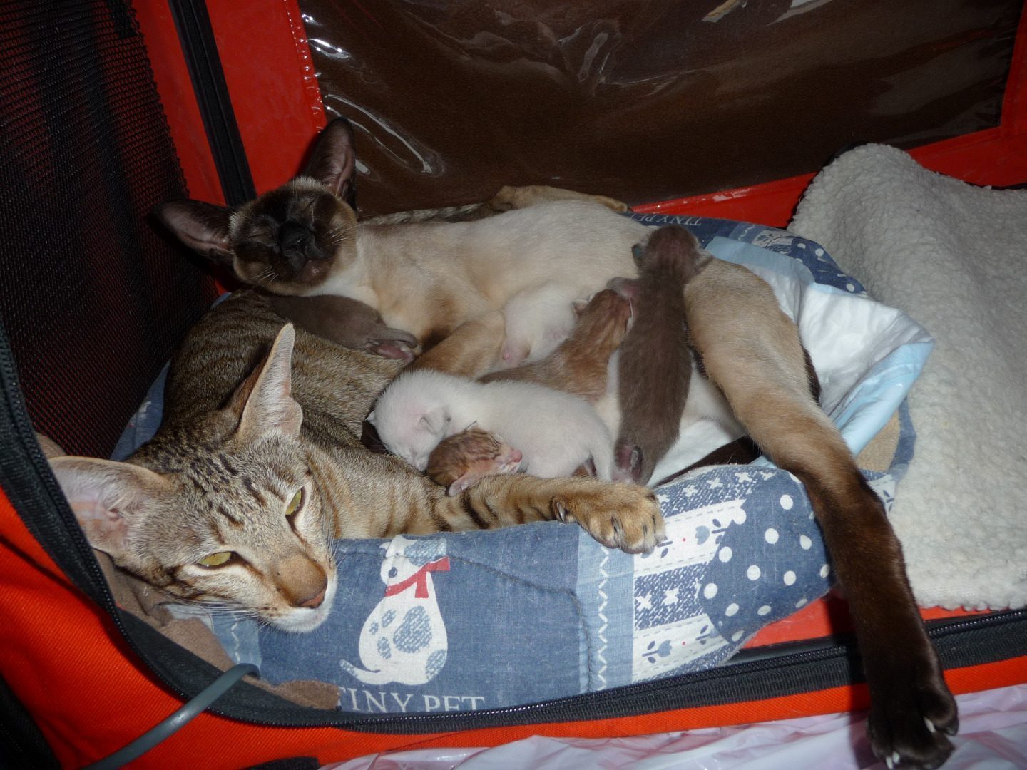 Tous élevés proche de moi, nés dans mon lit, partageant tous les moments de la vie à la maison (cuisine, chambre, salle de bain, dodos, maman, tata, (papa "poule" siamois faisant l'éducation) grand-père, grand-mère, la famille... quoi.