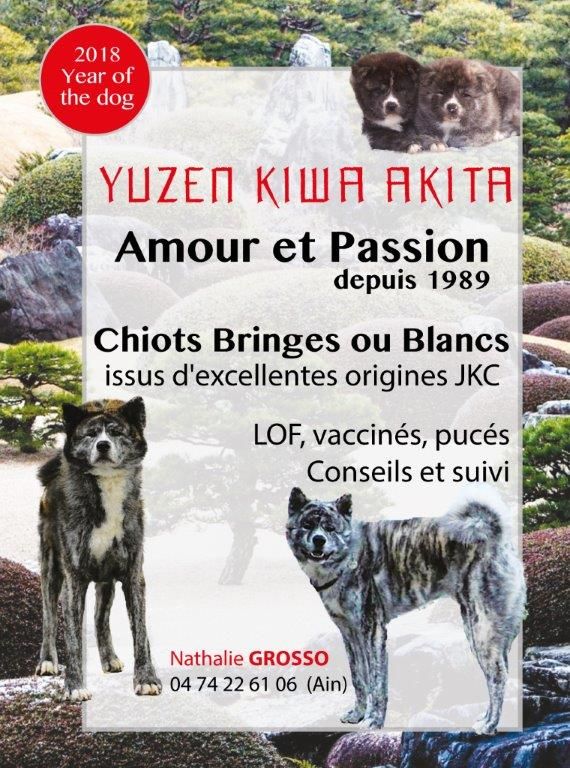 Spécialiste des AKITAS Bringés et Blancs depuis 1995 sous les particules H'YU et YUZEN puis Affixe YUZEN KIWA depuis 2000, productrices de plusieurs Recommandés Championnes et Champion.