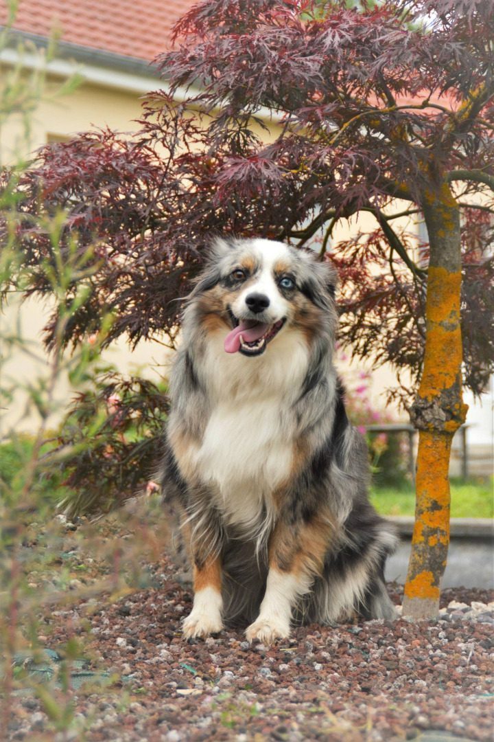 J'ai un berger américain miniature femelle bleue merle porteuse de rouge avec moi.